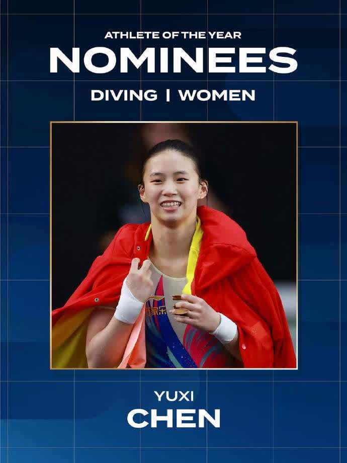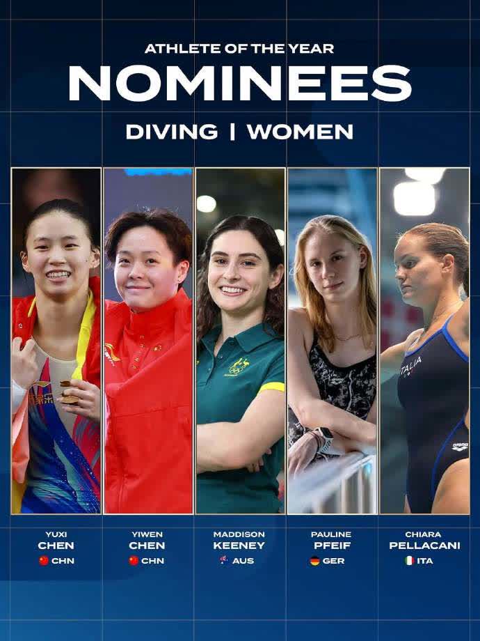 世界泳聯今日(14日)公布年度最佳女子跳水運動員候選名單,中國選手陳芋汐、陳藝文入圍。陳芋汐憑藉在新加坡世錦賽斬獲女子單雙人10米台及混合團體三金的佳績,成為獎項的有力競爭者。