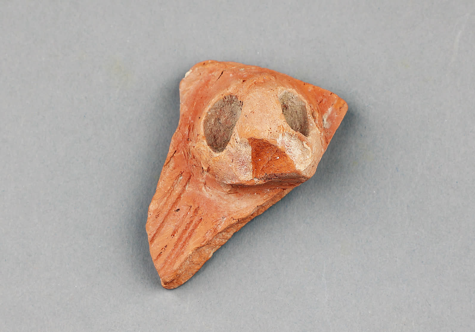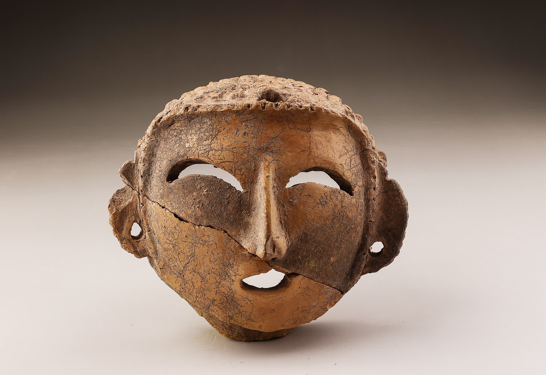 在眾多的出土文物中,「微笑版」陶塑人面像最為引人關注。這件人面像寬約14厘米,為泥質紅陶,加工精緻,頭頂飽滿,遠古先民用從後向前的密集戳刺紋表示頭髮,額頂正中有穿孔,兩鬢連至下頜。面部泥條盤築,兩眼鏤空月牙形,鼻樑貼塑,挺直,略呈鷹鉤狀。口部鏤空微張,呈微笑狀。雙耳扁平,貼於臉頰兩側,耳垂下方有穿孔耳洞。