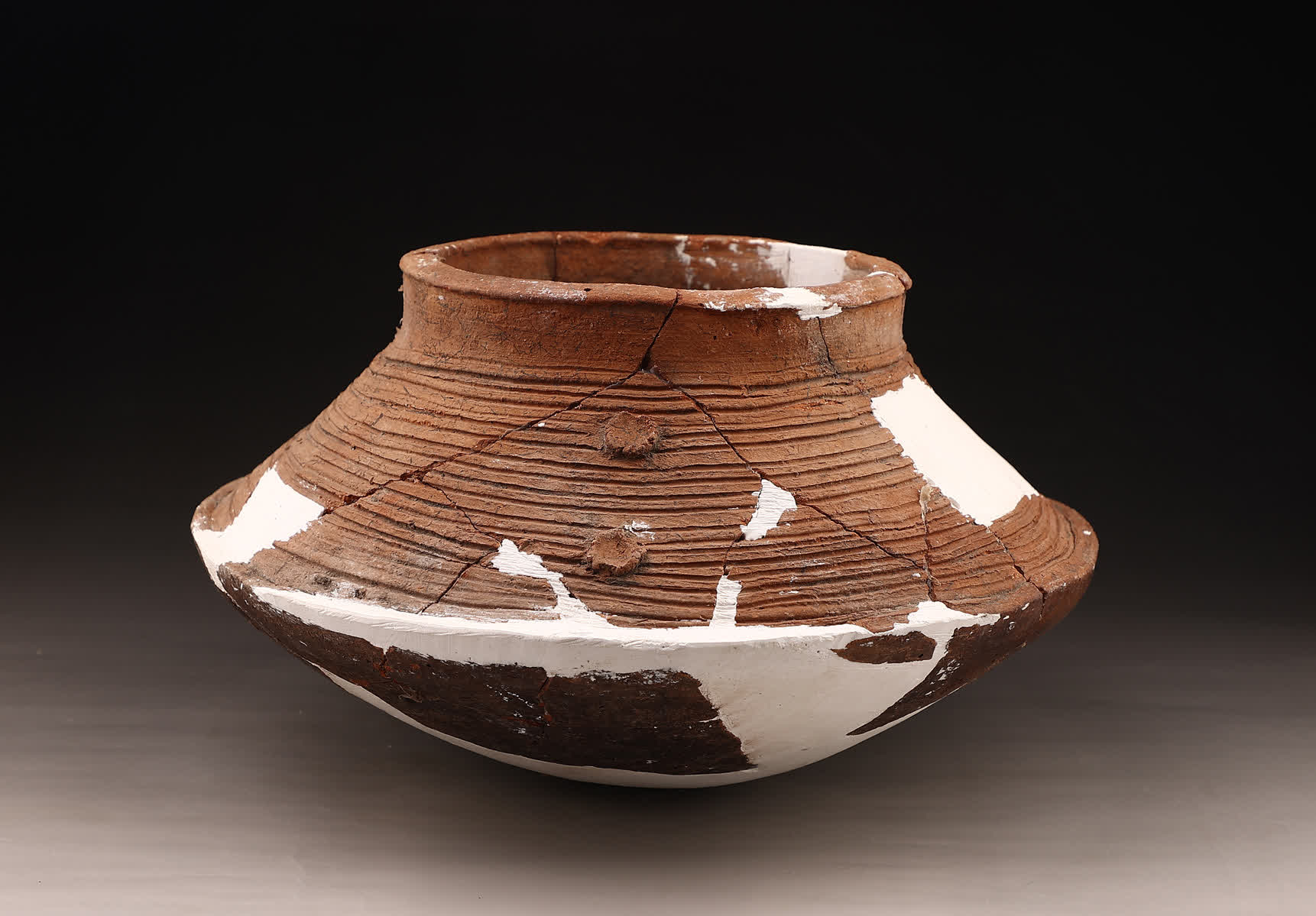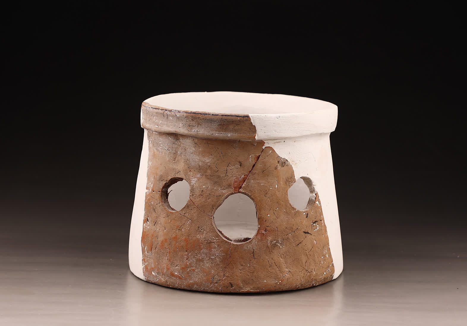 值得一提的是,考古工作者在遺址北發掘區內,亦發現了7座傾斜狀複合結構的陶窯。特別是其中的Y7陶窯保存較完整,由窯室、火道、火膛和操作間組成。窯室平面圓形,周壁以厚約6至8厘米的草拌泥塗抹,長期火燒呈紅褐色,質地堅硬,底部一周分布8個長條形出火孔。出火孔連通近環形的火道,火道緊貼窯室周壁環繞一圈,首尾兩端斜向下通入火膛。火膛略呈橢圓柱體,原先火膛後部上端應有火口。操作間則位於火膛西側,壁面斜直,底部平坦。