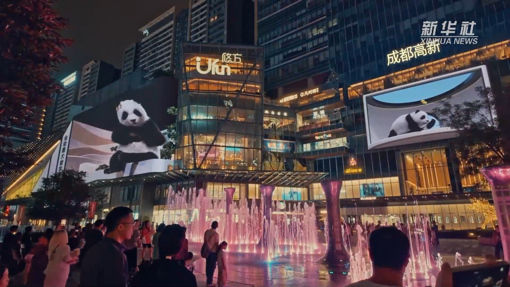 近日,成都高新區交子大道上的裸眼3D數字熊貓上了全新動效!隨着橙紅色「幕布」落下,一隻備受喜愛的裸眼3D數字熊貓靈巧地「爬上」建築外牆,不時轉頭「看向」圍觀人群,最後悠閑地「坐下」,吸引了眾多市民遊客來此打卡。
