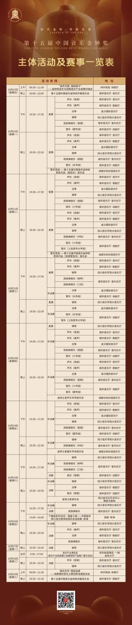 中國音樂金鐘獎是由中共中央批准、全國唯一常設的音樂綜合性大獎,自2001年創辦以來,已成功舉辦十四屆。自第十二屆以來,中國音樂金鐘獎已連續四屆在成都舉辦。本屆金鐘獎將開展由主體賽事演出、產業座談、人才對接、金鐘快閃等構成的「5+8」系列活動,將吸引全國優秀選手、專家評委、國際嘉賓等1500餘名音樂界人士匯聚成都,預計2.9萬名觀眾走進音樂廳,覆蓋超20萬名觀眾遊客參與線下金鐘獎相關活動,共襄音樂盛事。