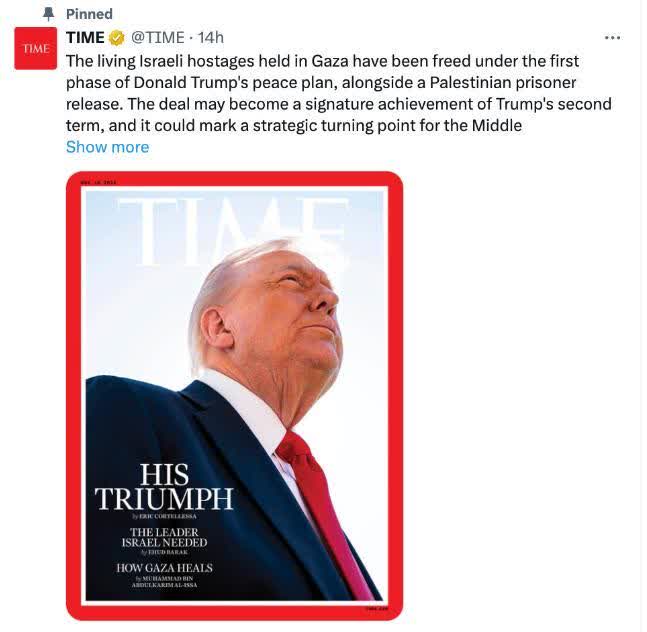 《時代》雜誌封面於當地時間13日公布,標題為「他的勝利」,封面是一張從特朗普下方拍攝的照片,照片中特朗普正抬頭凝視,彷彿被明亮的陽光照亮。