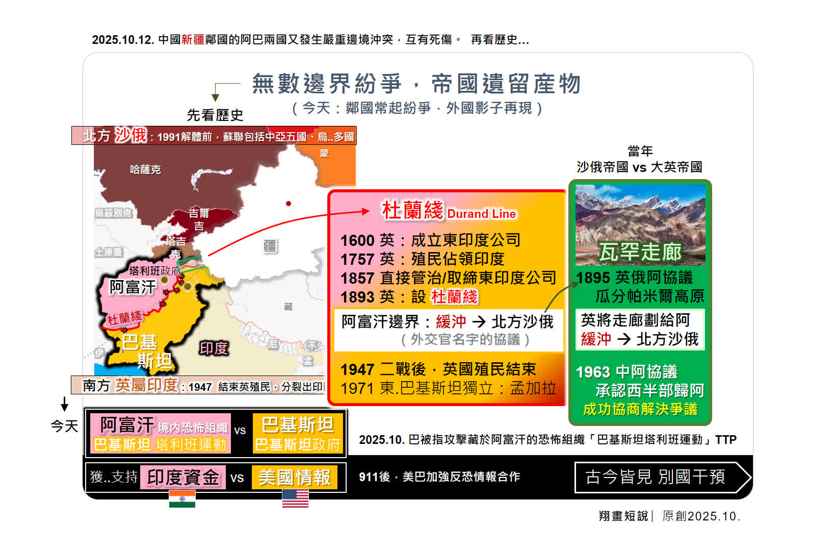 2025 年 10 月,在我國新疆旁的兩個鄰國,阿富汗與巴基斯坦邊境再度爆發激烈衝突。這場國與國的戰火根源,可追溯至一個多世紀前帝國主義劃下的邊界線,杜蘭德線(Durand Line)。