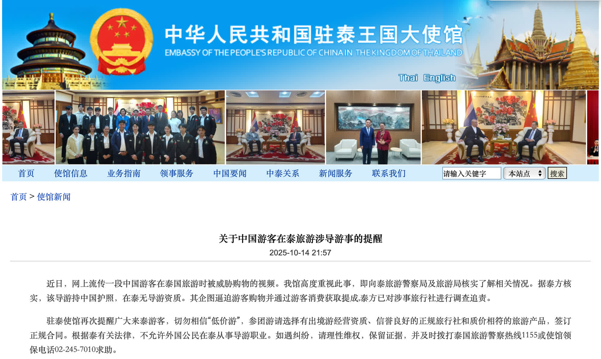 駐泰使館再次提醒廣大來泰遊客,切勿相信「低價遊」,參團遊請選擇有出境遊經營資質、信譽良好的正規旅行社和質價相符的旅遊產品,簽訂正規合同。根據泰有關法律,不允許外國公民在泰從事導遊職業。如遇糾紛,請理性維權,保留證據,並及時撥打泰國旅遊警察熱線1155或使館領保電話02-245-7010求助。