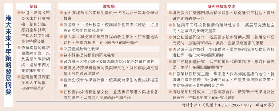 香港大學昨日公布策略發展計劃《展望十年2026-2035:領行·啟迪世界》,為大學未來十年的發展制定戰略藍圖和發展方向。計劃訂明,港大的願景是成為引領人類未來的世界級大學,強調要善用及深度探索人工智能(AI),引領大學革新,並會憑藉獨特的傳統和國際地位,以廣闊的學術網絡,連結東西方並發揮影響力。為此,港大將全面實施為每名本科生提供內地及海外各一次學習交流的機會,並會更着力招收東亞地區以外,世界不同角落的優秀學生,致力打造真正國際化的學習環境,深度發展數碼化教學等,多方面支持港大成為全球頂尖大學。●香港文匯報記者 姜嘉軒