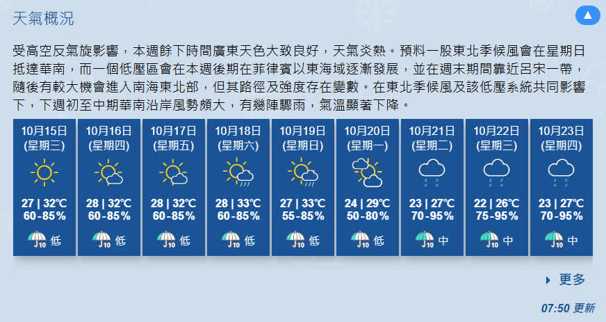 天文台預料一股東北季候風會在星期日抵達華南,下周初至中期華南沿岸風勢頗大,有幾陣驟雨,氣溫顯著下降。