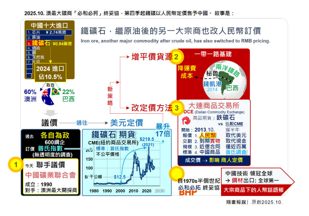 中國作為全球最大鐵礦石進口國,也是中國第三大進口商品,2024年進口量超過12億噸。其中六成從澳洲進口,但長期以來卻因定價機制受制於人而處於被動局面。鐵礦石價格過去由「普氏指數」(Platts)主導(其操作是通過調查取得交割價,而非真正成交價),必和必拓等國際礦商憑藉其市場地位,以美元為單一計價貨幣,持續推高進口成本。2011年,鐵礦石價格曾飆升至每噸219.5美元,而同期中國鋼鐵企業噸鋼利潤一度低於30元人民幣,「高價購礦、低利賣鋼」的局面困擾行業多年。