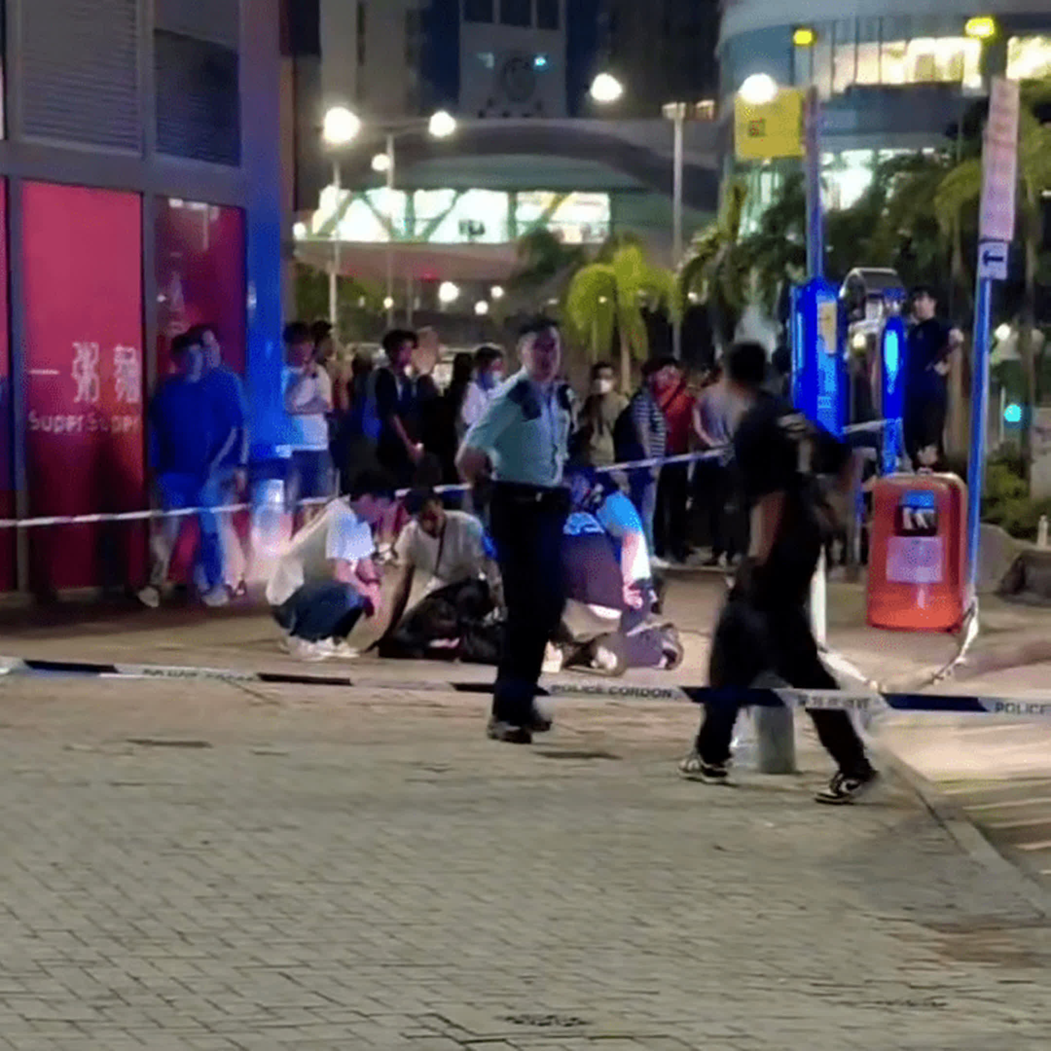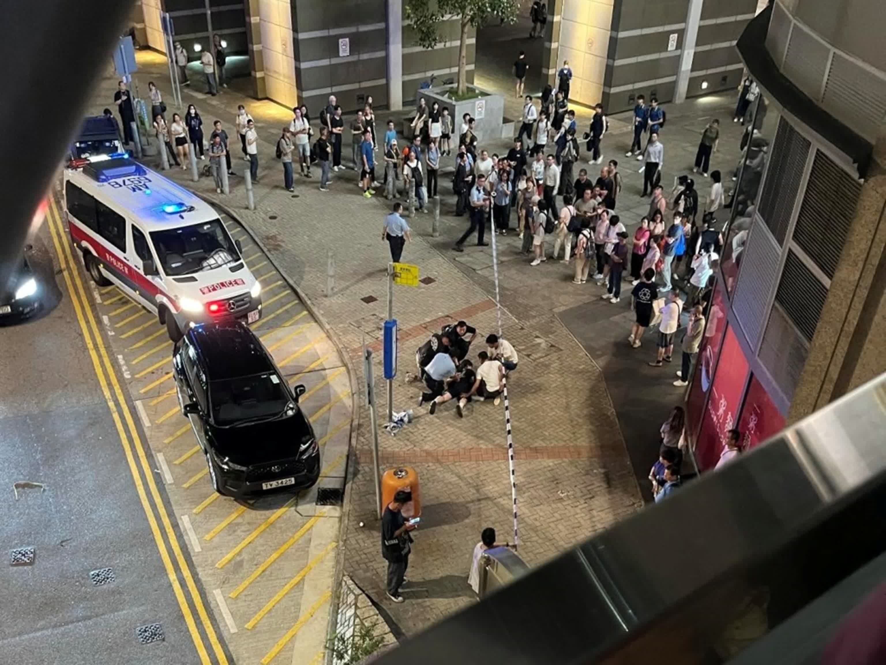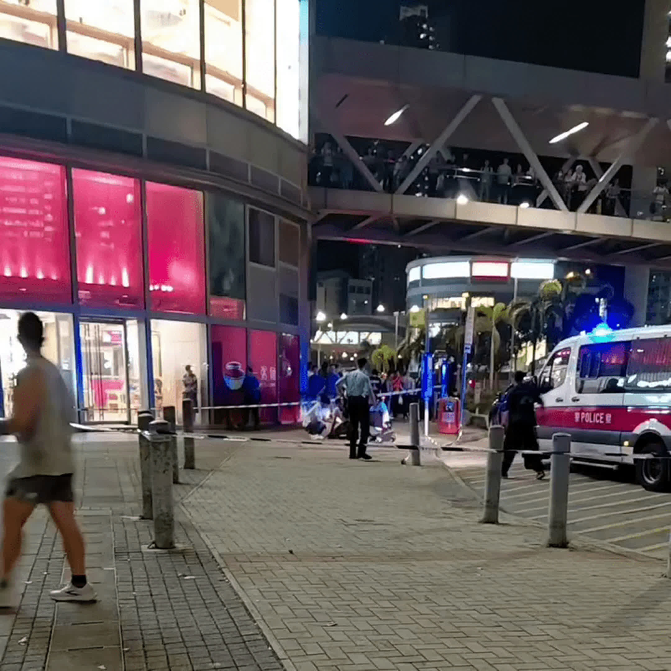 由網上片段所見,在都會駅商場外至少有4人將涉案男子按在地上制服,警員又拉起封鎖線避免途人靠近,吸引大批街坊在行人路及行人天橋上圍觀。據悉,有警員執法期間受傷。