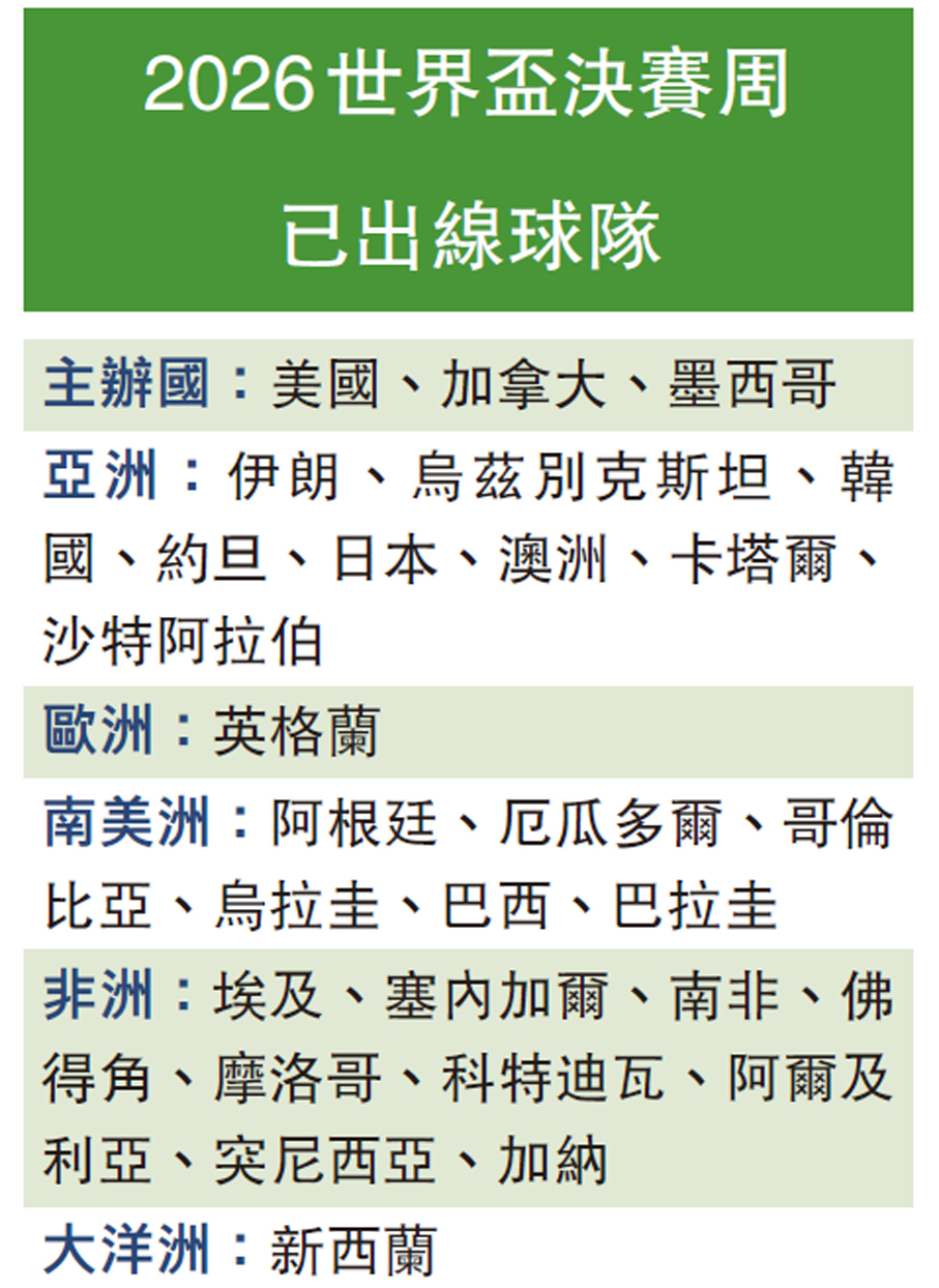香港時間周三(15日)凌晨上演多區世界盃外圍賽,結果英格蘭、科特迪瓦、塞內加爾、南非、卡塔爾和沙特阿拉伯共六支球隊在今輪比賽後,宣告獲得明年世界盃決賽周入場券,亦令出線球隊增加至28隊,目前只餘下20個席位尚待爭奪。 ●香港文匯報記者 楊浩然