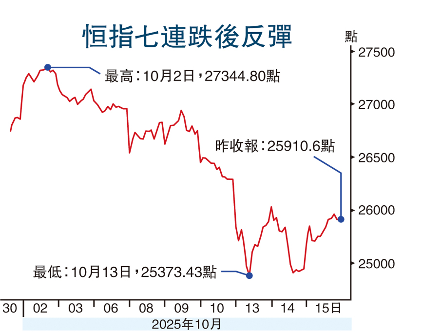 獨立股評人郭思治亦稱,港股由10月初開始調整,技術上調整期需要約3至4周,即投資者在整個10月份也不要抱任何憧憬。間中需有若干反彈,但大致上形態仍為先高後低、向下尋底,大市本月如何反彈,也不會再試本月份高位27,381點,至於本月低位25,331點是否可成為強力支持位,則需再作觀察。