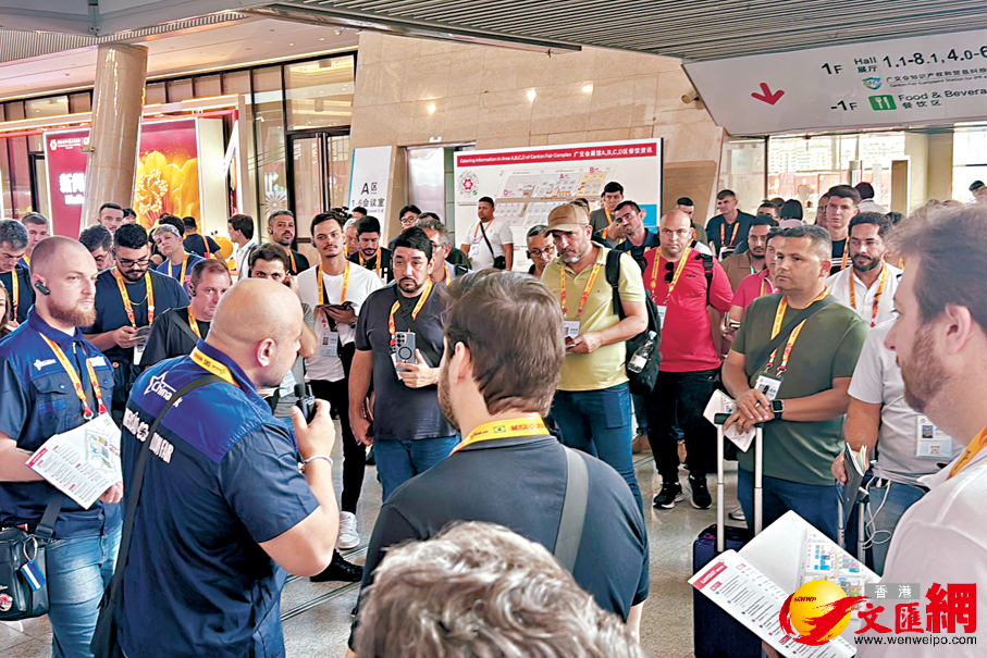 第138屆廣交會開幕首日,展館內外人流如織。不少外國採購商早早拖着行李箱前來排隊,還有不少成群結隊的外商採購團,由舉着小旗子的領隊帶領穿行在各個展館中尋覓商機。香港文匯報記者15日在現場看到,一個規模龐大的巴西採購商團早早在展廳內集合,領隊正拿着廣交會的介紹手冊給大家「劃重點」。該領隊介紹,這次採購團共有300多人參加,「中國的所有產品在巴西都很受歡迎,90%的產品都是中國製造的,例如比亞迪是現在巴西最熱門的品牌。」