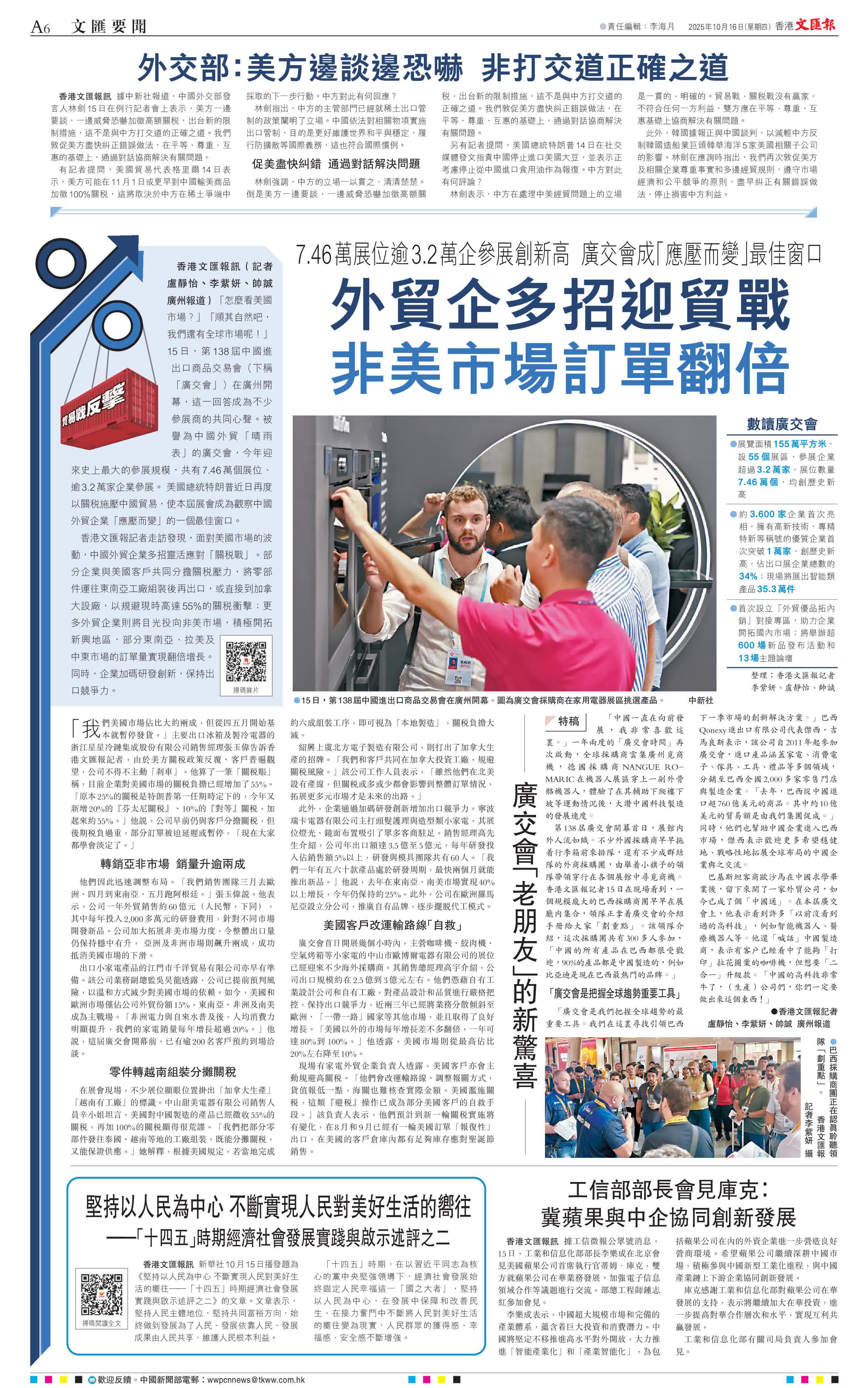 (香港文匯報記者 盧靜怡、李紫妍、帥誠 廣州報道)「怎麼看美國市場?」「順其自然吧,我們還有全球市場呢!」15日,第138屆中國進出口商品交易會(下稱「廣交會」)在廣州開幕,這一回答成為不少參展商的共同心聲。被譽為中國外貿「晴雨表」的廣交會,今年迎來史上最大的參展規模,共有7.46萬個展位、逾3.2萬家企業參展。美國總統特朗普近日再度以關稅施壓中國貿易,使本屆展會成為觀察中國外貿企業「應壓而變」的一個最佳窗口。