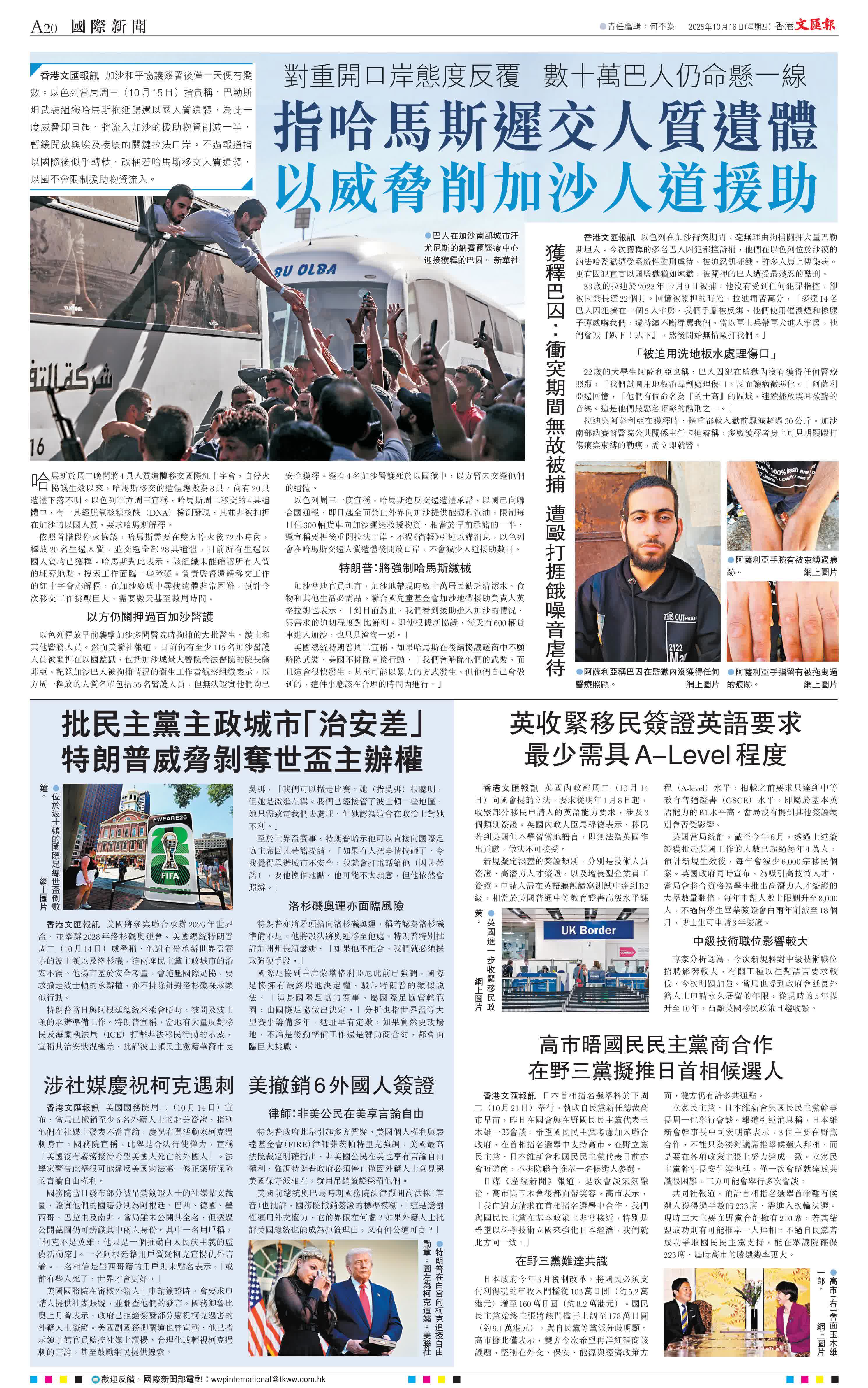 香港文匯報訊 加沙和平協議簽署後僅一天便有變數。以色列當局周三(10月15日)指責稱,巴勒斯坦武裝組織哈馬斯拖延歸還以國人質遺體,為此一度威脅即日起,將流入加沙的援助物資削減一半,暫緩開放與埃及接壤的關鍵拉法口岸。不過報道指以國隨後似乎轉軚,改稱若哈馬斯移交人質遺體,以國不會限制援助物資流入。