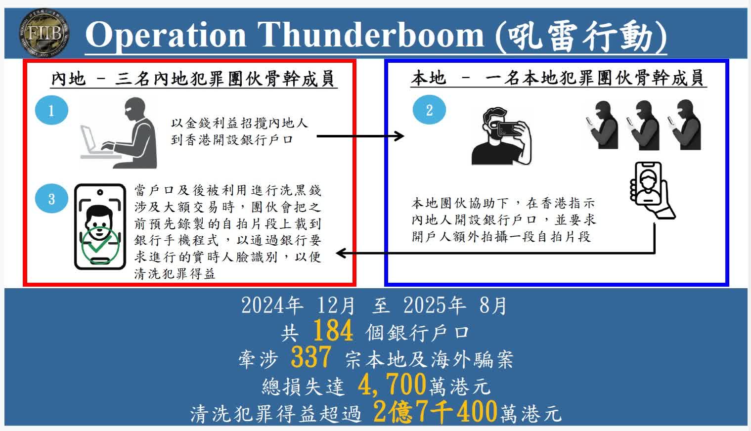 至前日(14日)及昨日(15日),香港警方聯同內地公安展開代號「吼雷」聯合執法行動,成功在深港兩地共拘捕3名集團骨幹成員。當中在香港,警方以涉嫌「串謀洗黑錢」罪拘捕一名姓盧(32歲)、報稱從事代購行業的本地男子,相信為集團骨幹成員,懷疑他與內地集團的成員招攬人士從內地到香港,再安排他們透過互聯網在數字銀行遙距開設銀行戶口從而獲取酬勞。警方其後搜查疑犯的酒店房間,共檢獲5部手機,並在手機內發現多段懷疑傀儡戶口持有人的自拍短片。該名被捕男子亦先後利用自己持有的16個銀行戶口,在去年1月至今年7月期間,共清洗5,400萬懷疑犯罪得益。該名被捕人已被警方暫控3項洗黑錢罪,將於今日稍後時間在東區裁判法院提堂。