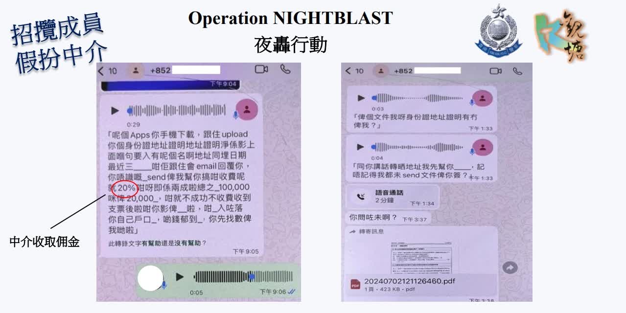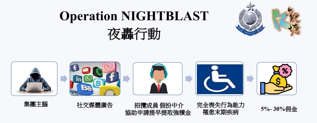 觀塘警區重案組第一隊督察梁曼宜指出,警方調查發現,有犯罪集團主腦假冒中介,透過社交媒體廣告,聲稱可以安排中介替被捕人提早取回他們的強積金。這些所謂的中介會協助被捕人向強積金受託人公司提交虛假醫生證明,聲稱完全喪失行為能力或罹患末期疾病,目的是希望提早取回強積金供款。而被捕人只需要把他們的個人資料以及在申請表格上以電子方式簽名,再透過社交平台交給這些所謂中介,雙方從來沒有見面。