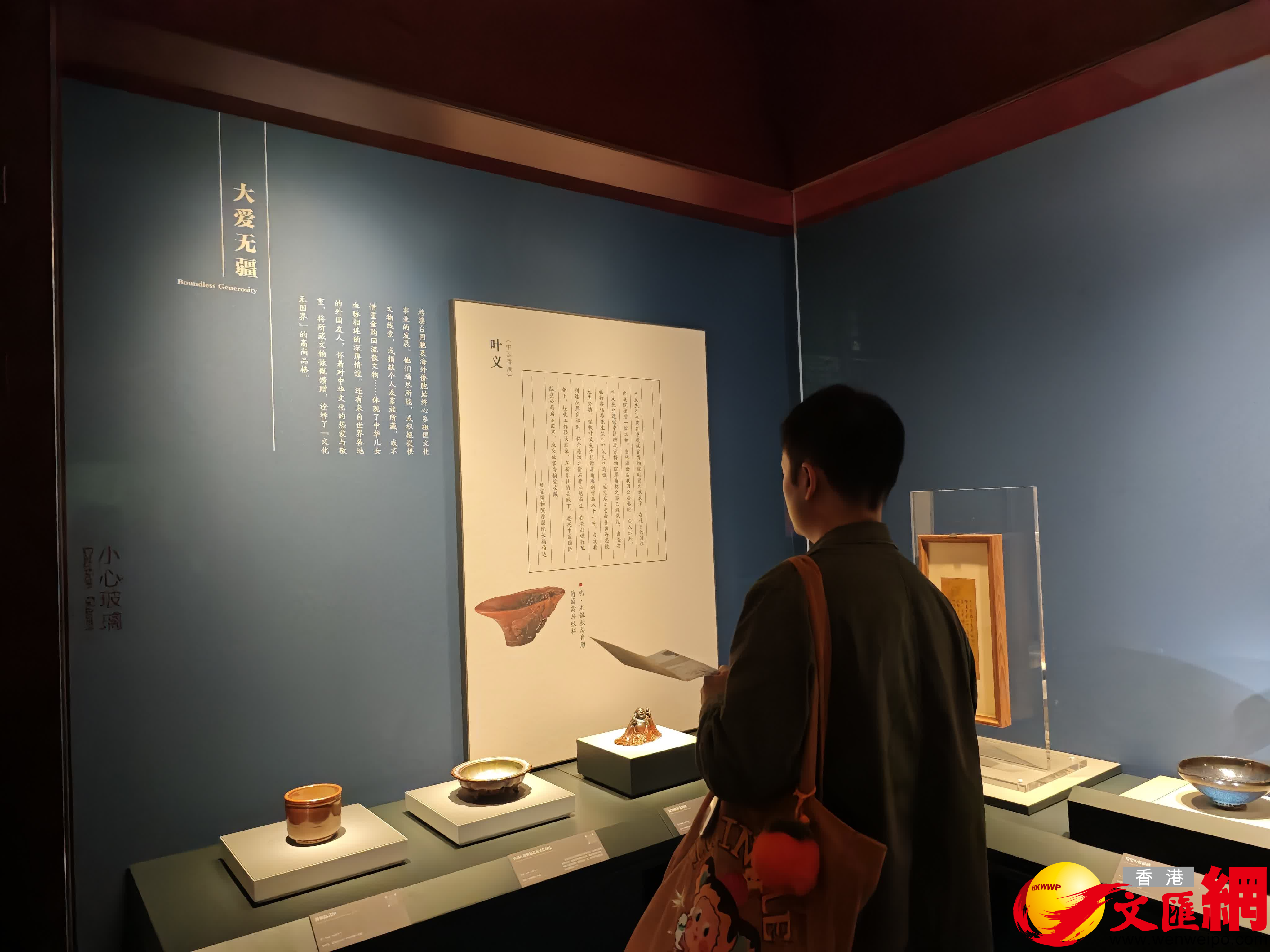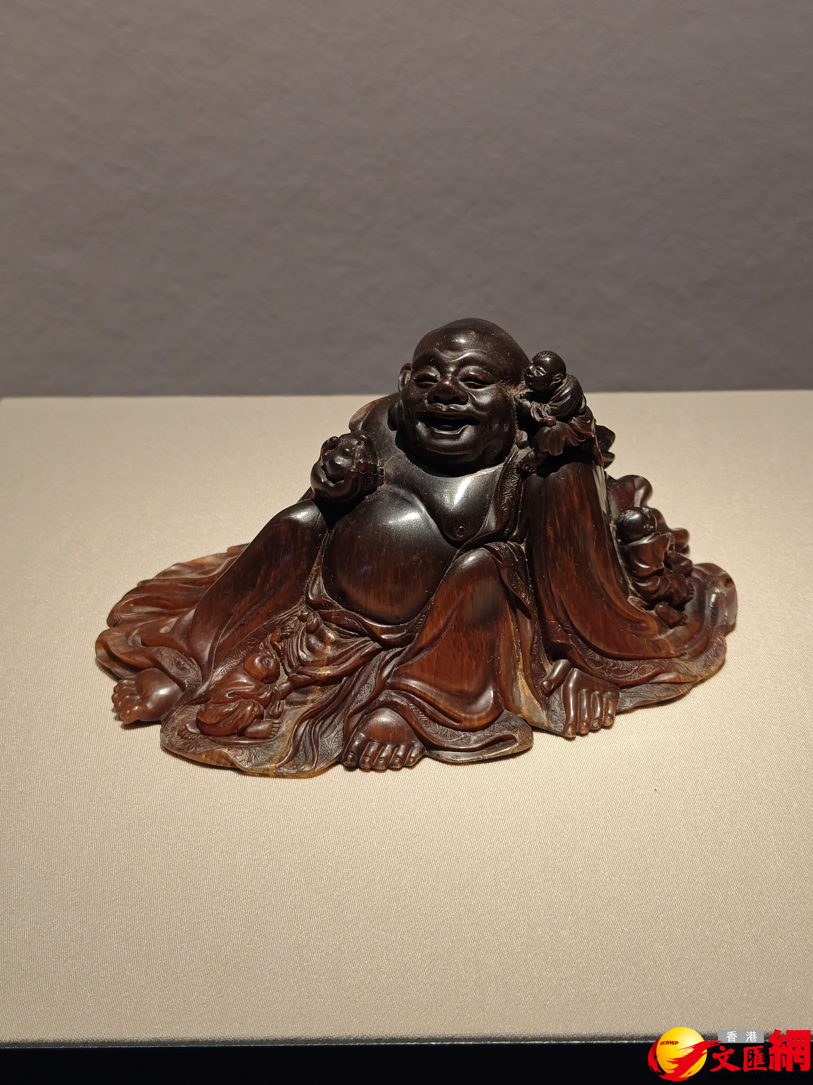 記者在「大愛無疆」小節中看到了多件來自港澳台人士的捐贈文物。香港的葉義捐贈的一件清代犀角雕彌勒佛像是重點展品之一。雕像呈深慄色,以圓雕技法隨形刻畫一尊布袋和尚,袒胸露腹,赤足曲肱,開口大笑,神情慈祥,右手持桃,斜倚布袋而坐。又雕小童數人於其身周肩上嬉戲調笑。這件小雕像巧妙利用了犀角本身形態,將人物神態傳達得活靈活現,體現了創作者不俗的藝術水準。