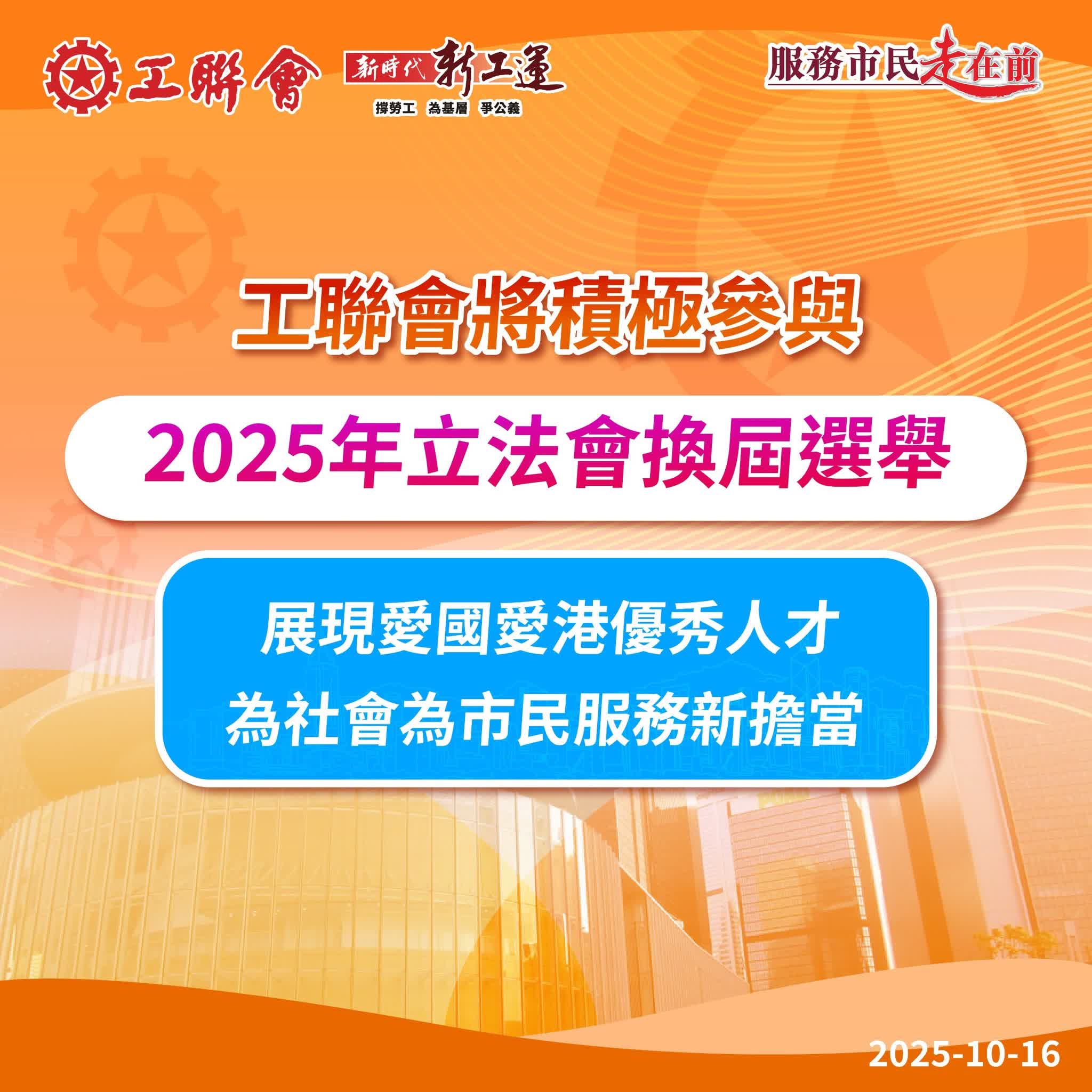 工聯會作為愛國愛港力量主力軍、參與良政善治的生力軍,堅定支持國家發展,全力配合特區政府依法有效施政、落實香港發展藍圖。工聯會將積極參與新一屆立法會換屆選舉,並於下星期舉行理事會時議決參選名單並適時公布,確保選舉工作有序推進及展開。