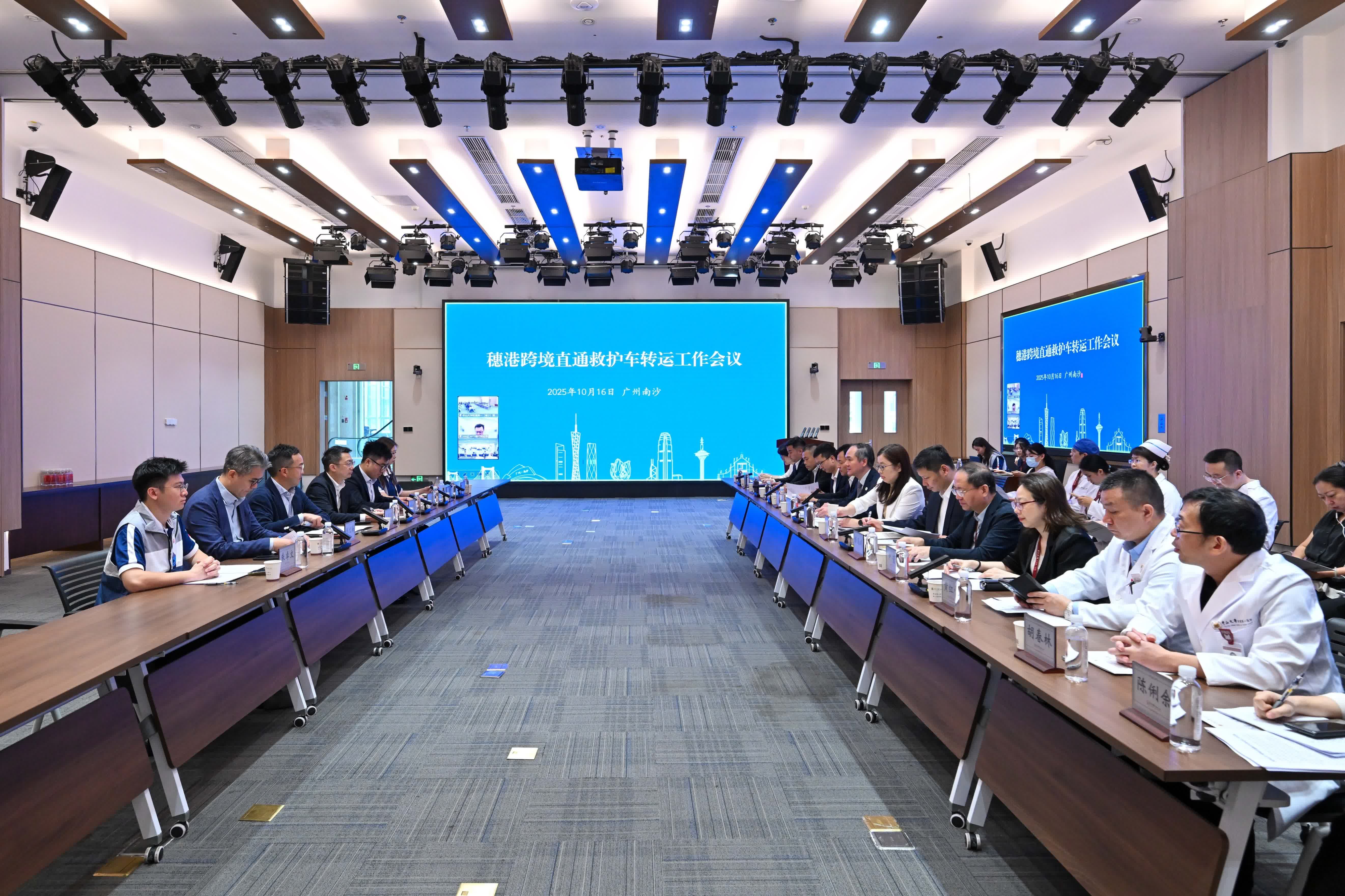 香港特別行政區(特區)政府今日(10月16日)聯同廣州市南沙區人民政府就「大灣區跨境直通救護車試行計劃」(試行計劃)進行演練,測試在模擬載送病人的情況下的救護車跨境由中山大學附屬第一醫院南沙院區至屯門醫院的行車路線及出入境安排。