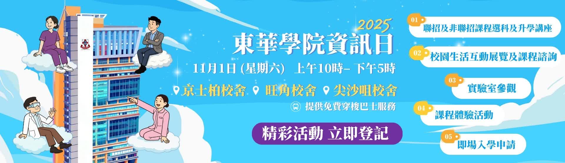 地點:東華學院京士柏校舍、旺角校舍及尖沙咀校舍(提供免費穿梭巴士服務)