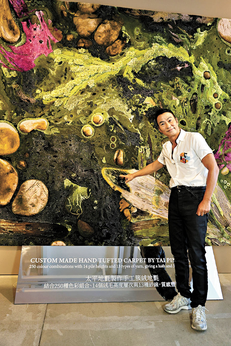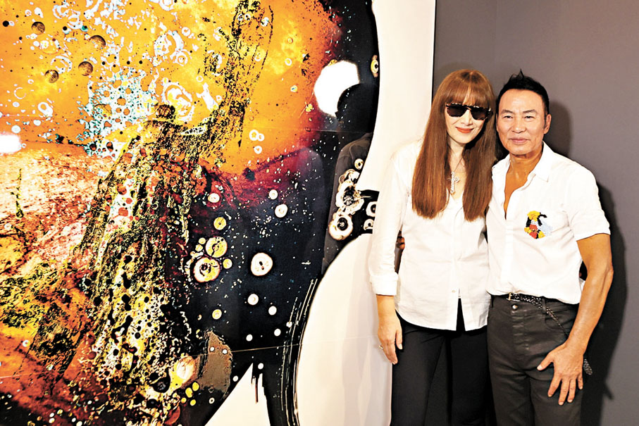 談到今次展覽,以華哥的畫作轉化設計成地毯、時裝及飾品,華哥開心表示這些藝術品可以賣出去,而賣了也才有另一番創作,有不同的演變。他花上七個多月去籌備今次展覽,單是以畫作做成地毯和中式刺繡都要4個月,水墨及其他製作也費時。華哥除了答謝香港特區政府和好友們的支持外,更公開答謝太太琦琦,因為今次的靈感泉源百分百來自太太,尤其那些大耳環飾品。琦琦表示聽到丈夫這樣說好開心:「疫情隔離時,他經常在畫畫,一間全白色的房被他整到一點點黑色,於是便買了一間工作室送給他,作為我和女兒對他最大的支持,因為以他為傲!」