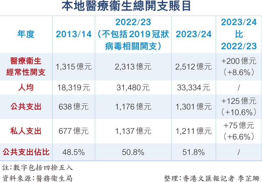在香港人口老齡化情況下,公共醫療開支顯著增加。特區政府醫務衞生局昨日發表2023/24年度《本地醫療衞生總開支賬目》,該年度醫療衞生經常性開支高達2,512.07億元,較上一個年度(不包括2019冠狀病毒病相關開支)增加約200億元,升幅8.6%,近52%用於公共醫療系統,十年間升一倍;人均醫療衞生經常性開支為33,334元。隨着長者人口由164萬增至2036年的244萬,令醫療體系面對嚴峻挑戰,公營醫療收費改革迫在眉睫,對於明年起公立醫院上調藥物收費及急症室等費用,醫衞局強調調整收費對增加收入作用不大,但額外收入會全數投入公營醫療系統中。 ●香港文匯報記者 李芷珊