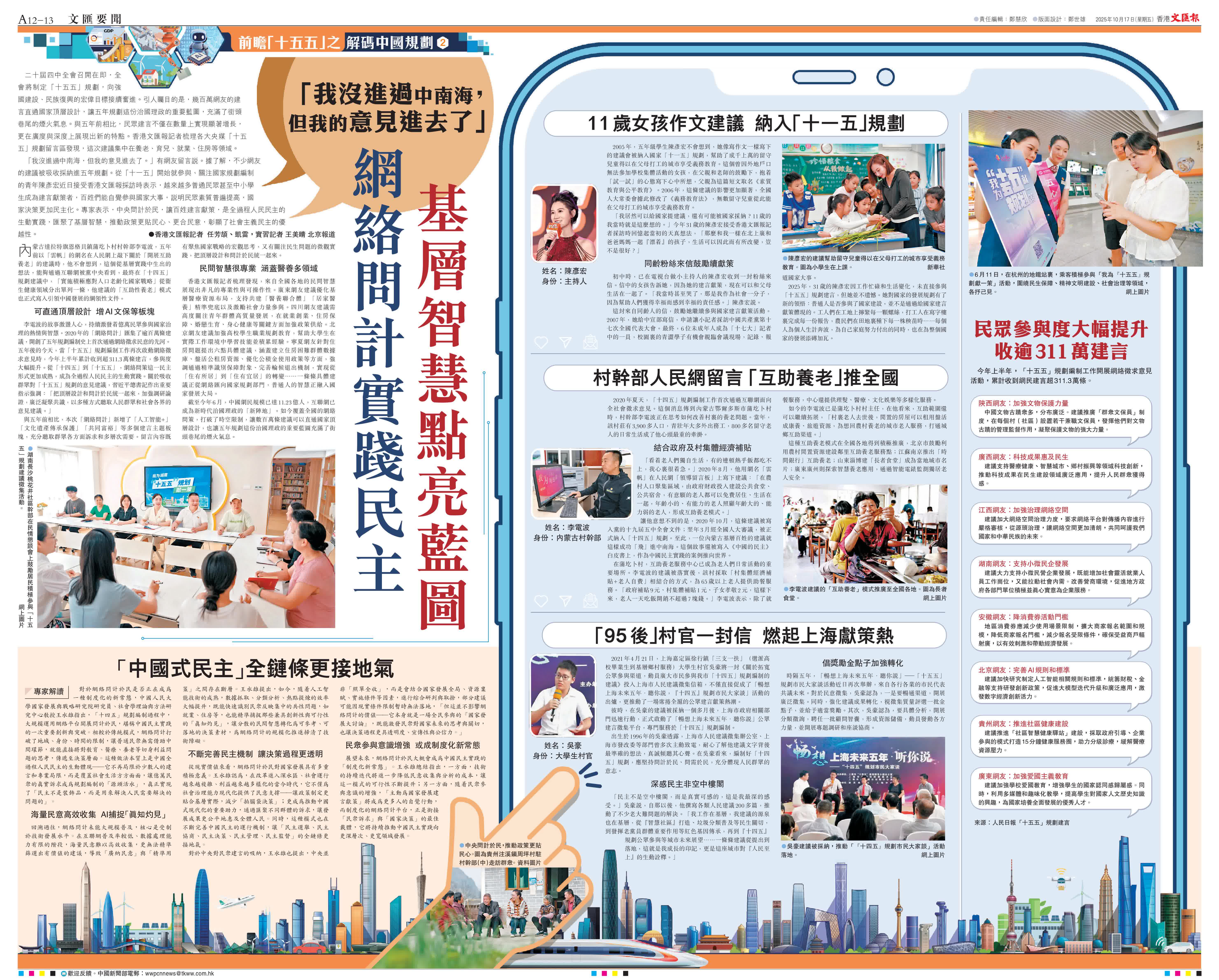 「我沒進過中南海,但我的意見進去了。」有網友留言說。據了解,不少網友的建議被吸收採納進五年規劃。從「十一五」開始就參與、關注國家規劃編制的青年陳彥宏近日接受香港文匯報採訪時表示,越來越多普通民眾甚至中小學生成為建言獻策者,百姓們能自覺參與國家大事,說明民眾素質普遍提高,國家決策更加民主化。專家表示,中央問計於民,讓百姓建言獻策,是全過程人民民主的生動實踐,匯聚了基層智慧,推動政策更貼民心、更合民意,彰顯了社會主義民主的優越性。