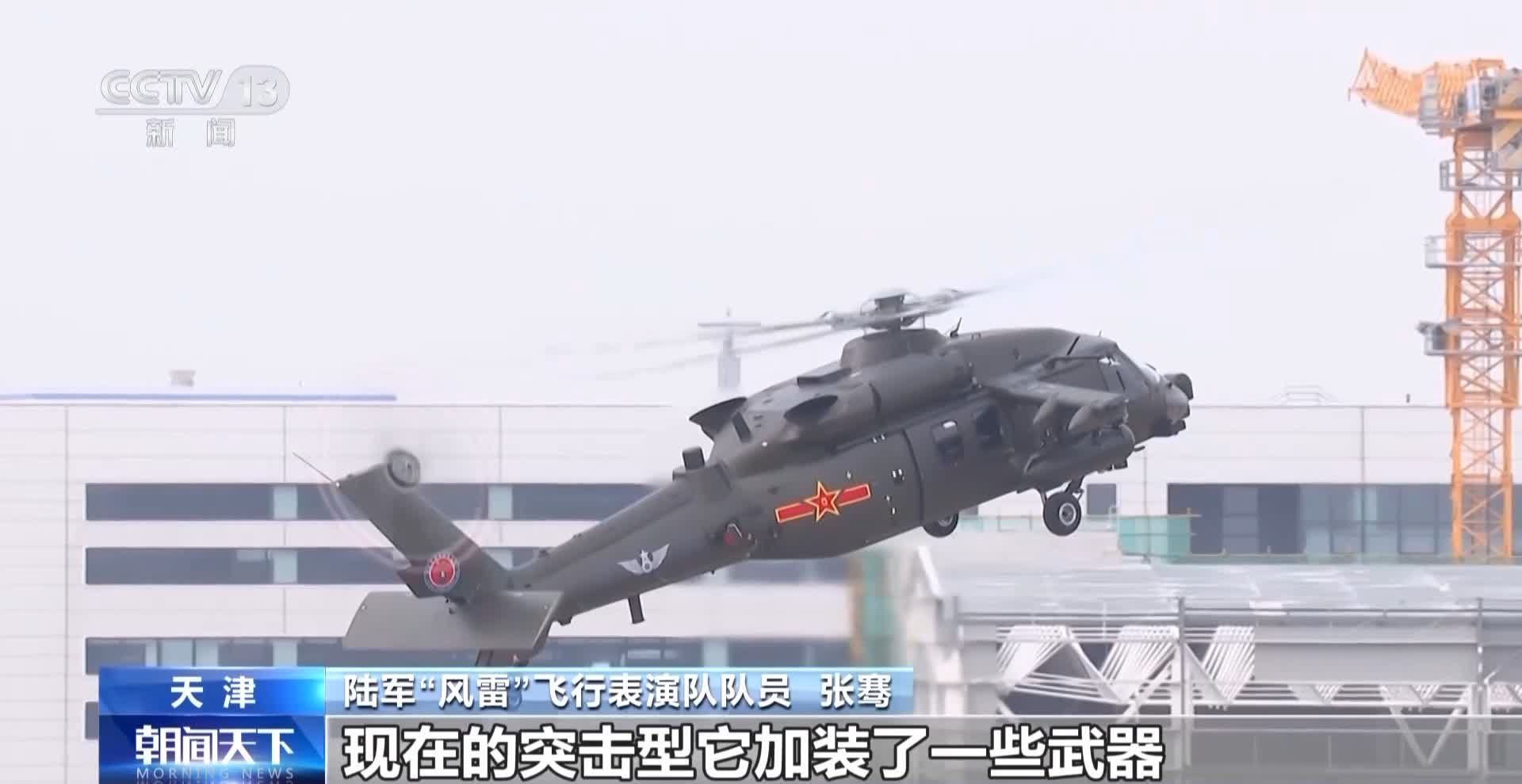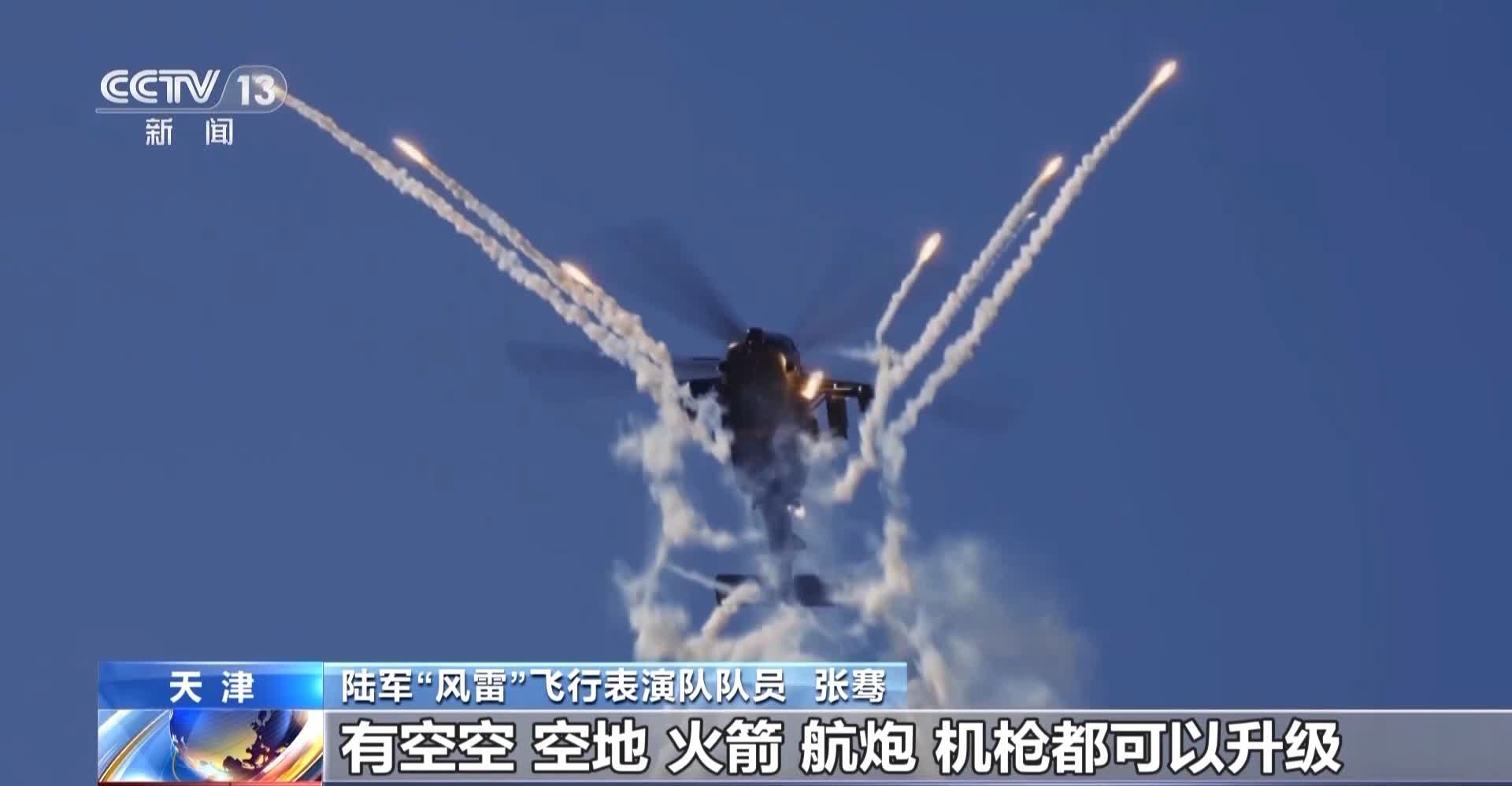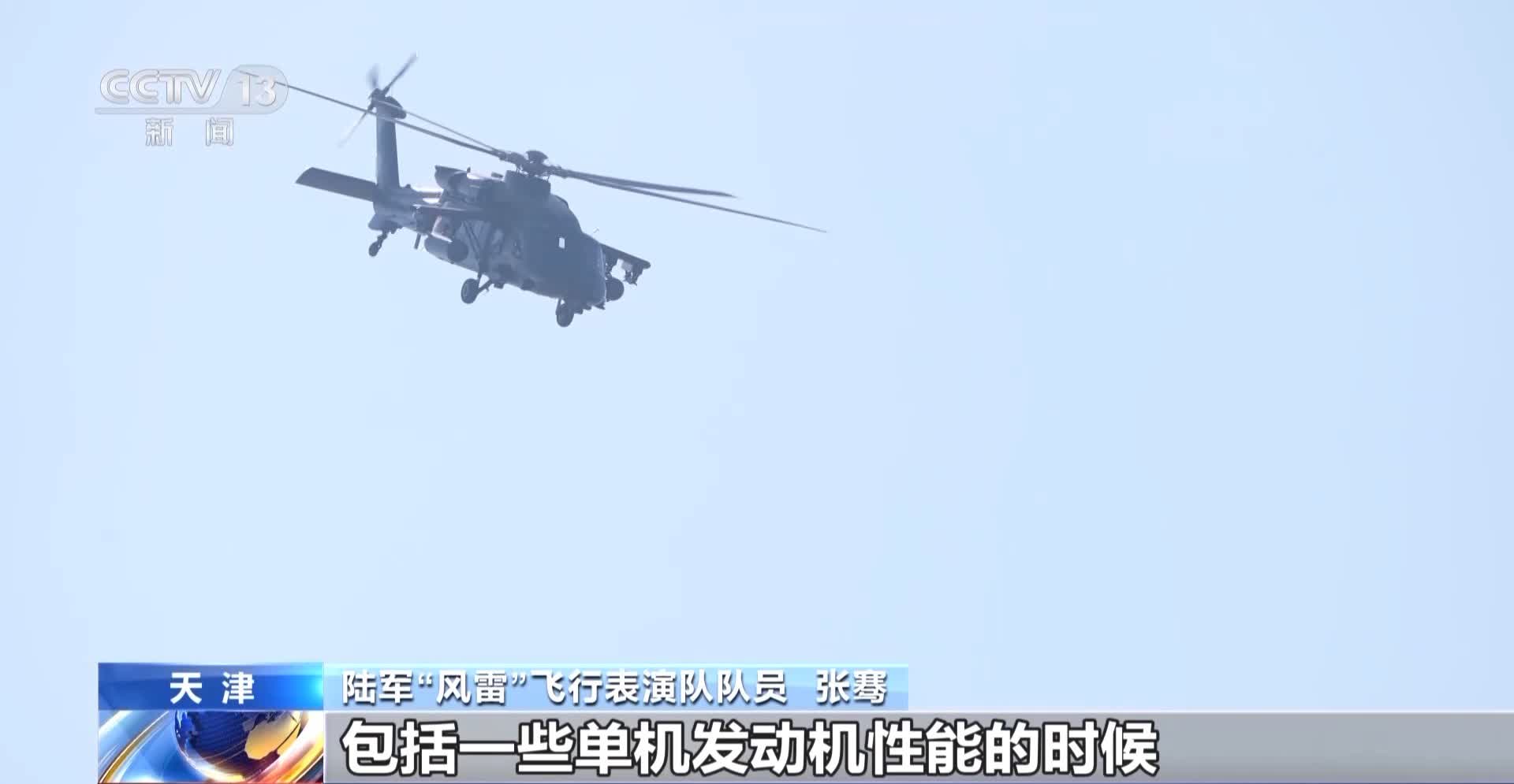 陸軍「風雷」飛行表演隊隊員 張騫:我們在展示它的突擊能力的時候,包括單機發動機的性能的時候,動作體現出它發動機的跟隨性特別好。它的自由渦輪的瞬間發熱能力、轉化成熱功率的能力,包括它的複合材料的旋翼結構發出來的聲音,包括它做一些動作的速度、頻率、快慢,專業人員能看到這款機型的跟隨性、飛控反應品質做得都非常好。