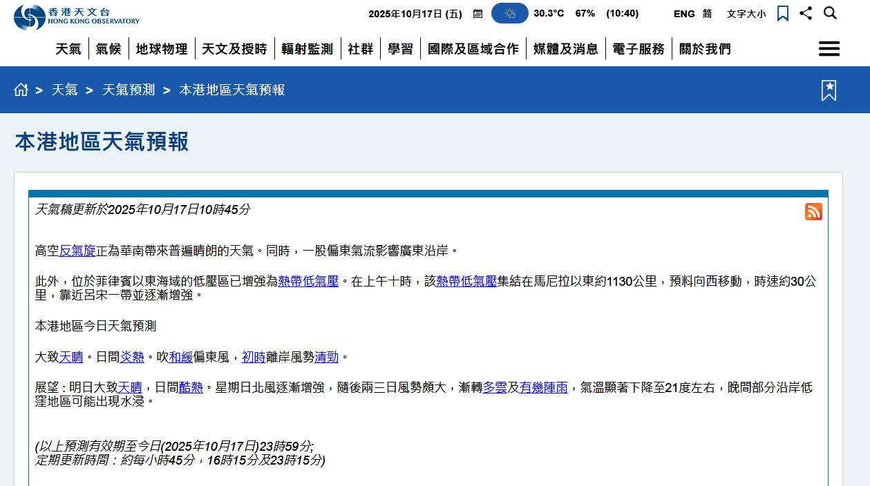 今日(17日),天文台表示,高空反氣旋正為華南帶來普遍晴朗的天氣。同時,一股偏東氣流影響廣東沿岸。