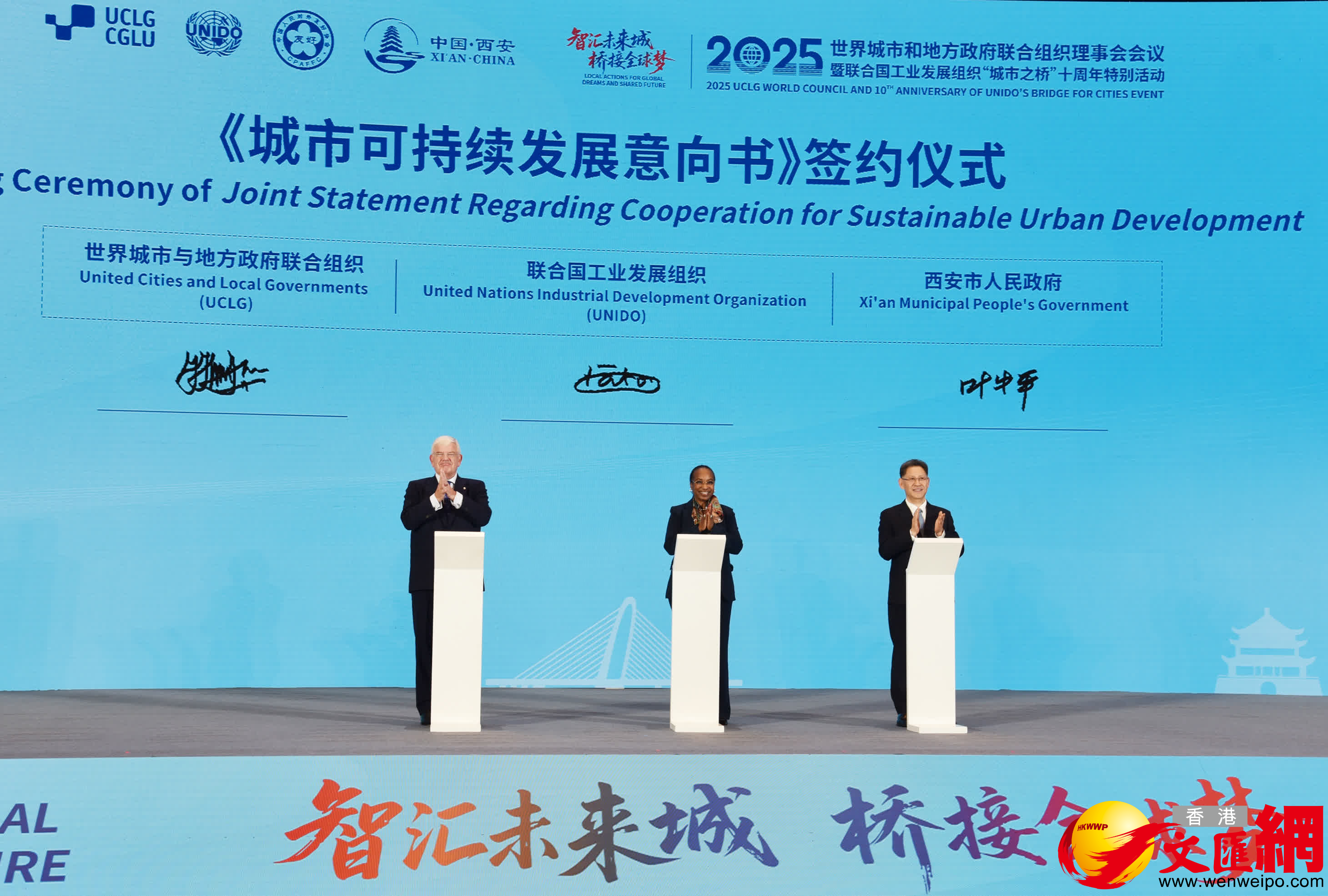 (香港文匯網記者 李陽波)智匯未來城,橋接全球夢。10月16日,2025年世界城市和地方政府聯合組織理事會會議暨聯合國工業發展組織「城市之橋」十周年特別活動在陝西西安開幕。本次活動吸引了來自全球50餘個國家和地區的600餘名嘉賓出席,在3天的會期中,各國代表聚焦並深入探討城市可持續發展、科技創新等城市治理專題,推動城市高質量發展。當天大會開幕式上,世界城地組織、聯合國工發組織、西安市人民政府亦簽署《城市可持續發展意向書》。