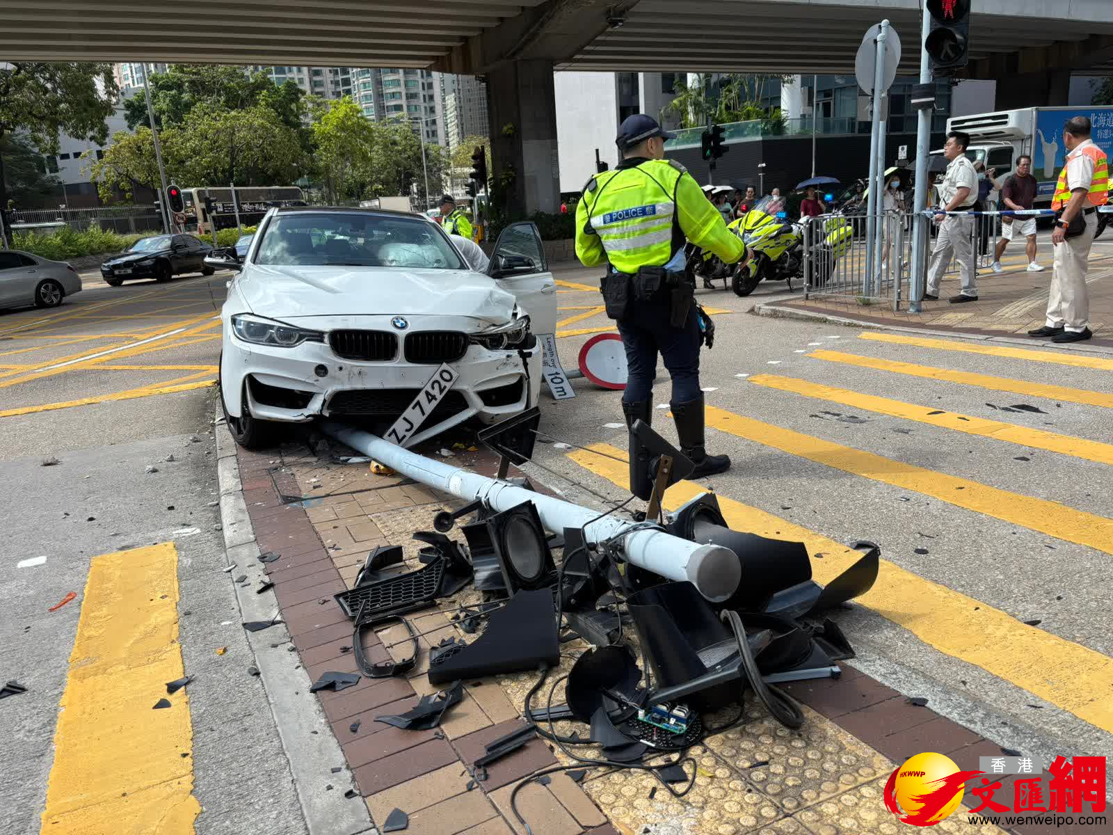 警員接報到場,意外中幸無人受傷,男司機在場助查。現場所見,涉事私家車車頭毀爛,交通燈組件碎片散落一地,路牌塌下被壓在私家車車底。警方一度封鎖現場,以便調查事故原因。