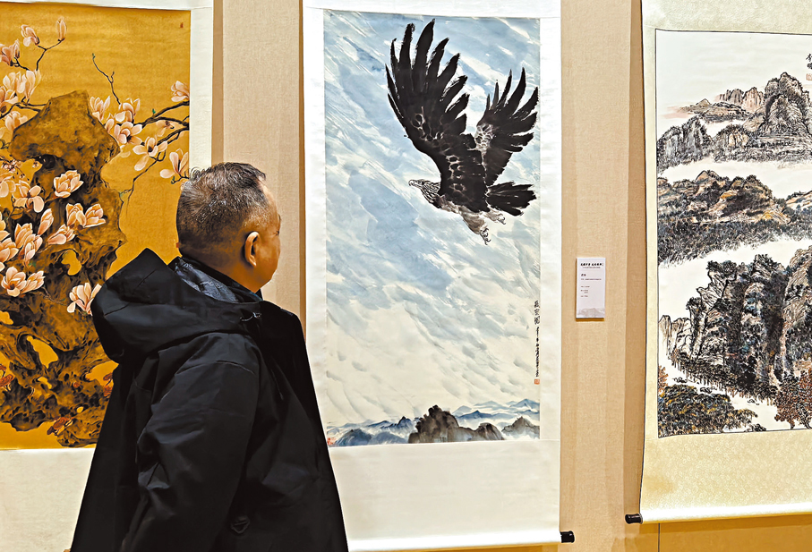 「希望我的作品能激發兩岸同胞共鳴。」畫家君壽介紹自己帶來的作品《長空圖》時難掩激動之情,他指向畫中展翅騰飛的雄鷹說,「『兩岸一家親』,希望我們能早日團圓,共同騰飛。」