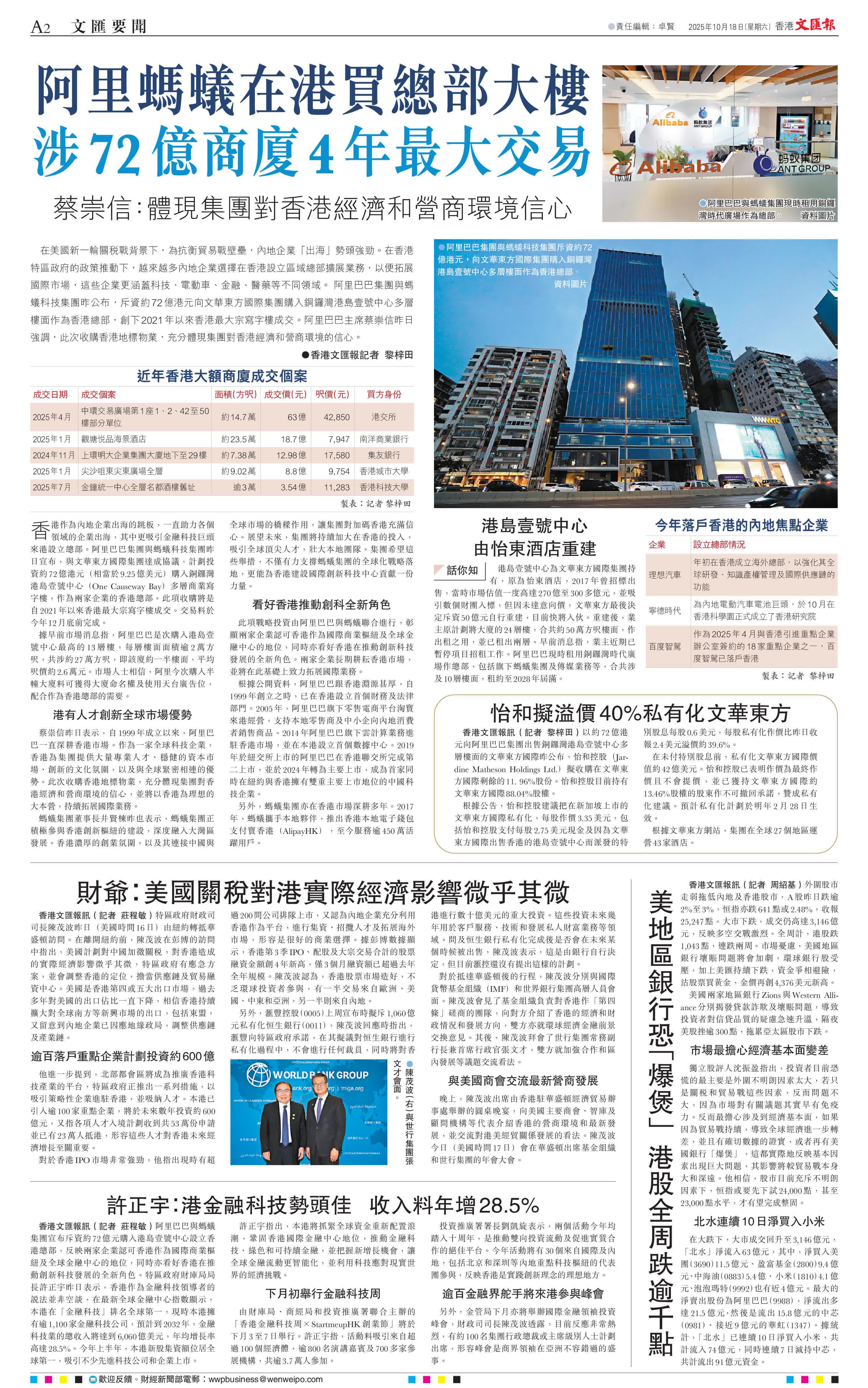 蔡崇信昨日表示,自1999年成立以來,阿里巴巴一直深耕香港市場。作為一家全球科技企業,香港為集團提供大量專業人才、穩健的資本市場、創新的文化氛圍,以及與全球緊密相連的優勢。此次收購香港地標物業,充分體現集團對香港經濟和營商環境的信心,並將以香港為理想的大本營,持續拓展國際業務。