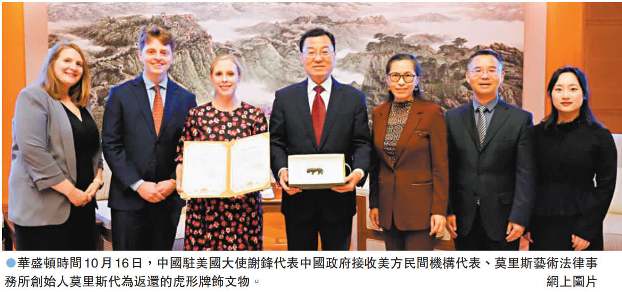 香港文匯報訊(記者 江鑫嫻 北京報道)中國流失文物再傳回歸好消息。中國駐美國大使館發布消息稱,華盛頓時間10月16日,中國駐美國大使謝鋒代表中國政府接收美方民間機構代表、莫里斯藝術法律事務所創始人莫里斯代為返還的虎形牌飾文物。謝鋒表示,中方將通過文物展覽等方式,向更多的人講述虎形牌飾文物背後的中美動人故事,把兩國人民的友好情誼傳遞下去。歡迎更多有識之士支持並參與推動流失文物返還原屬國。