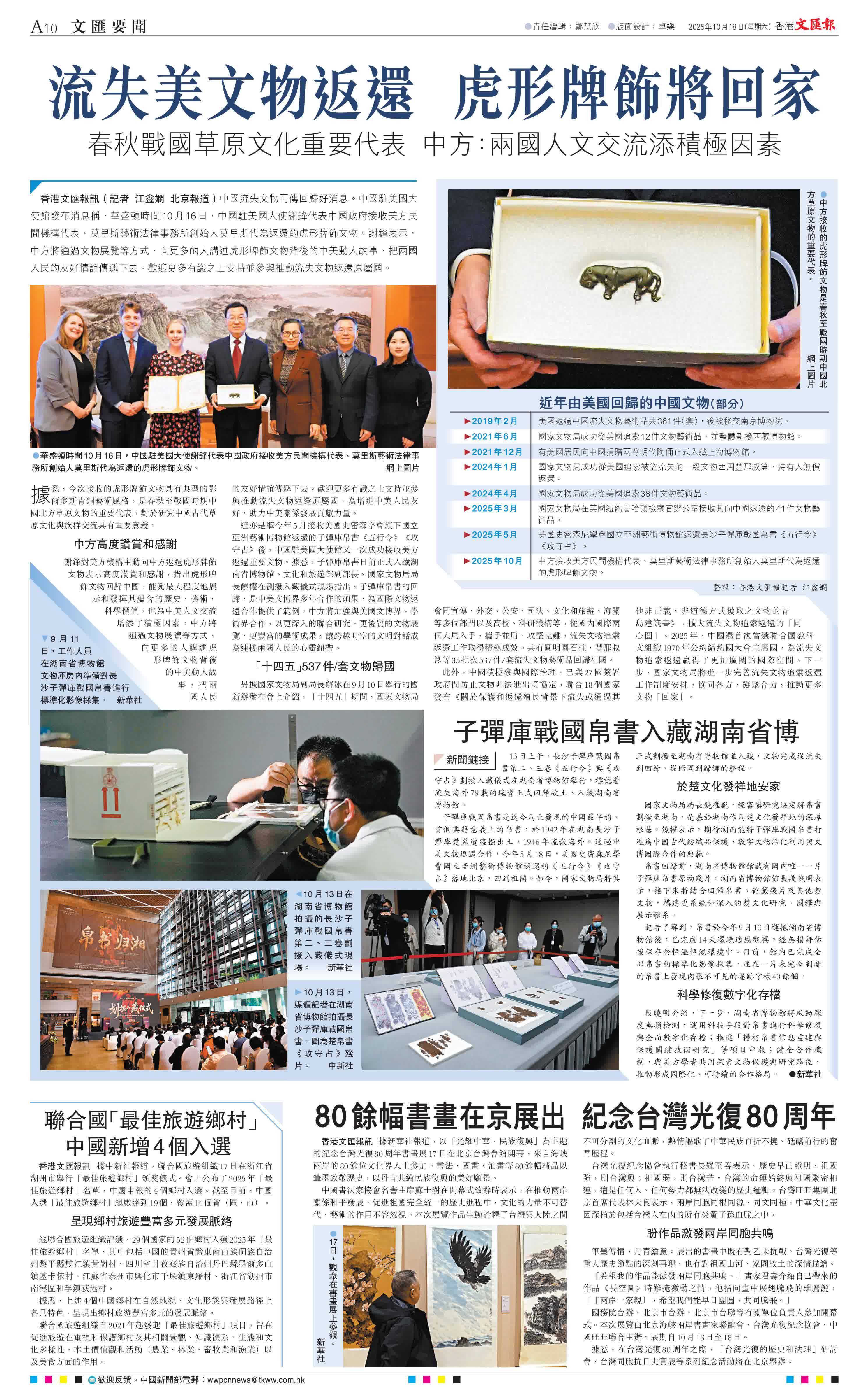 此外,中國積極參與國際治理,已與27國簽署政府間防止文物非法進出境協定,聯合18個國家發布《關於保護和返還殖民背景下流失或通過其他非正義、非道德方式獲取之文物的青島建議書》,擴大流失文物追索返還的「同心圓」。2025年,中國還首次當選聯合國教科文組織1970年公約締約國大會主席國,為流失文物追索返還贏得了更加廣闊的國際空間。下一步,國家文物局將進一步完善流失文物追索返還工作制度安排,協同各方,凝聚合力,推動更多文物「回家」。