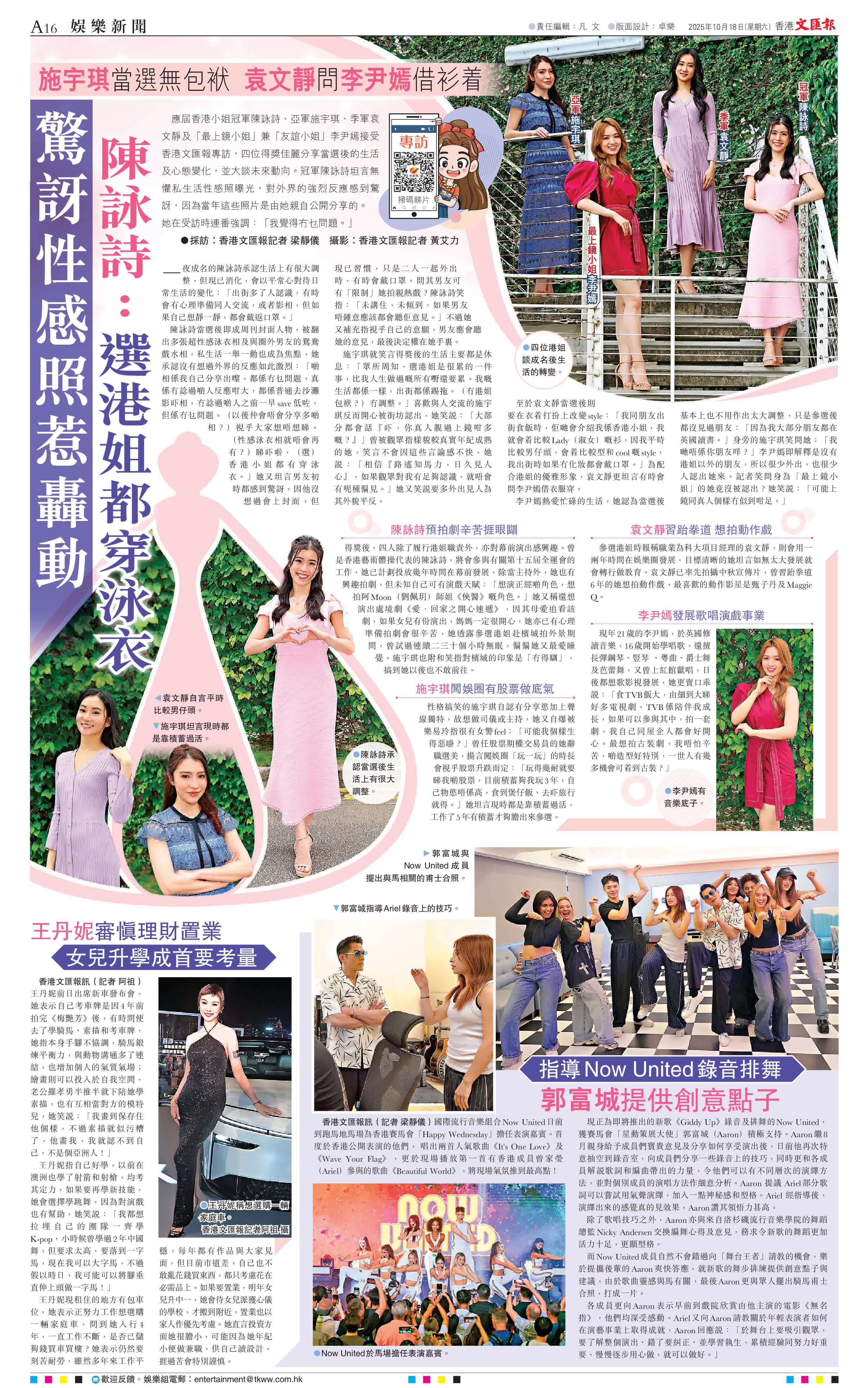 (香港文匯報記者 梁靜儀)應屆香港小姐冠軍陳詠詩、亞軍施宇琪、季軍袁文靜及「最上鏡小姐」兼「友誼小姐」李尹嫣接受香港文匯報專訪,四位得獎佳麗分享當選後的生活及心態變化,並大談未來動向。冠軍陳詠詩坦言無懼私生活性感照曝光,對外界的強烈反應感到驚訝,因為當年這些照片是由她親自公開分享的。她在受訪時連番強調:「我覺得冇乜問題。」
