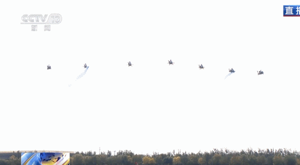 由5架直-10、2架直-20,共計7架直升機,組成箭形編隊,拉出三色彩煙。