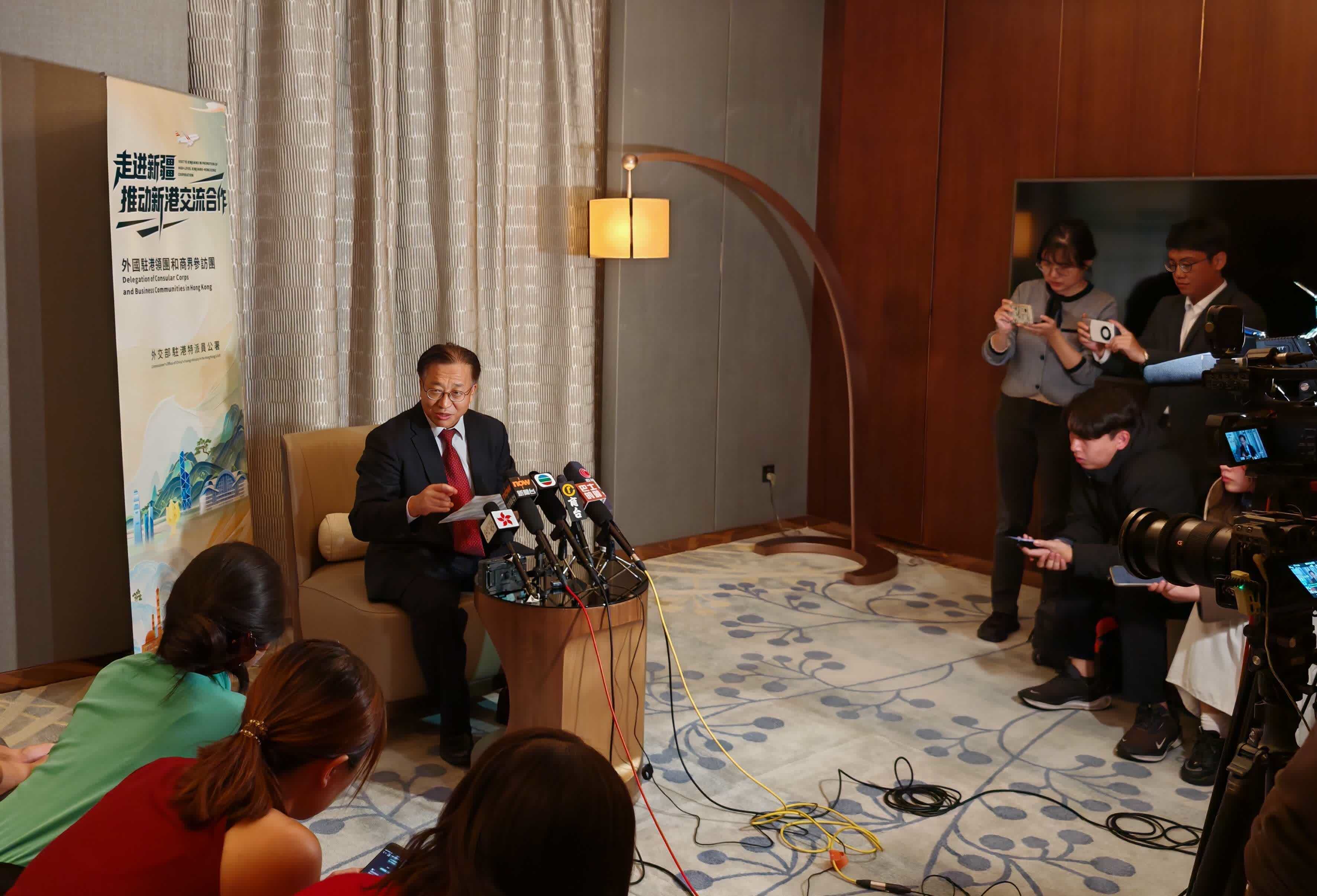 10月15日,外交部駐港公署特派員崔建春率外國駐港領團、商界、特區政府和媒體參訪團結束對新疆訪問之前,接受新華社、中新社、香港衛視、香港無綫電視、有線電視、Now TV、商業電台、巴士的報等隨行媒體聯合採訪,談新疆之行感想。