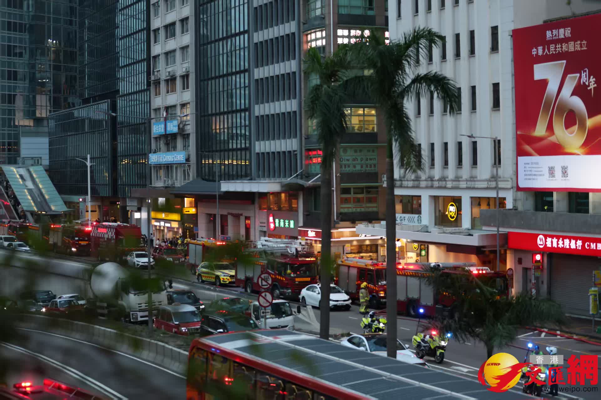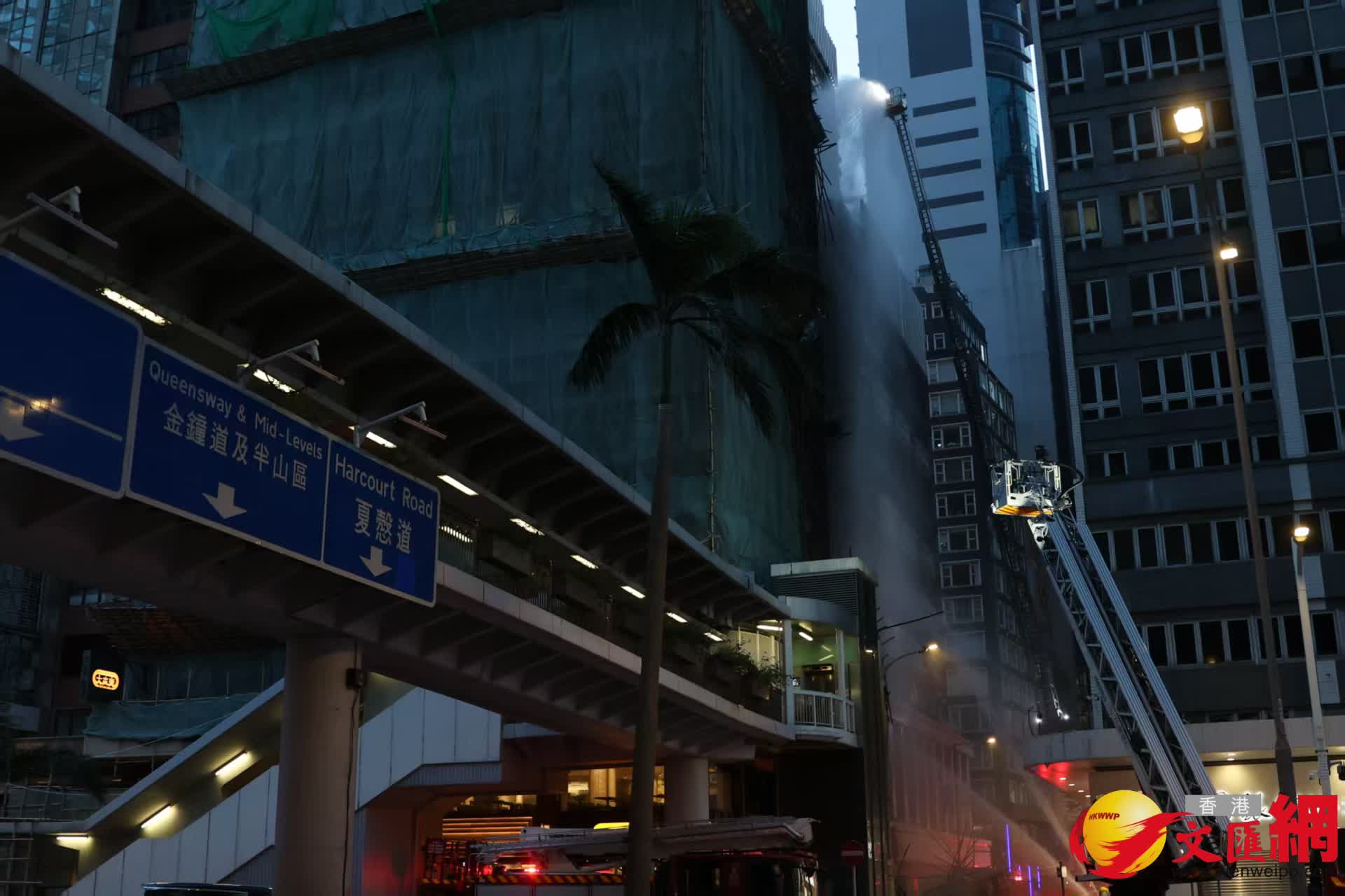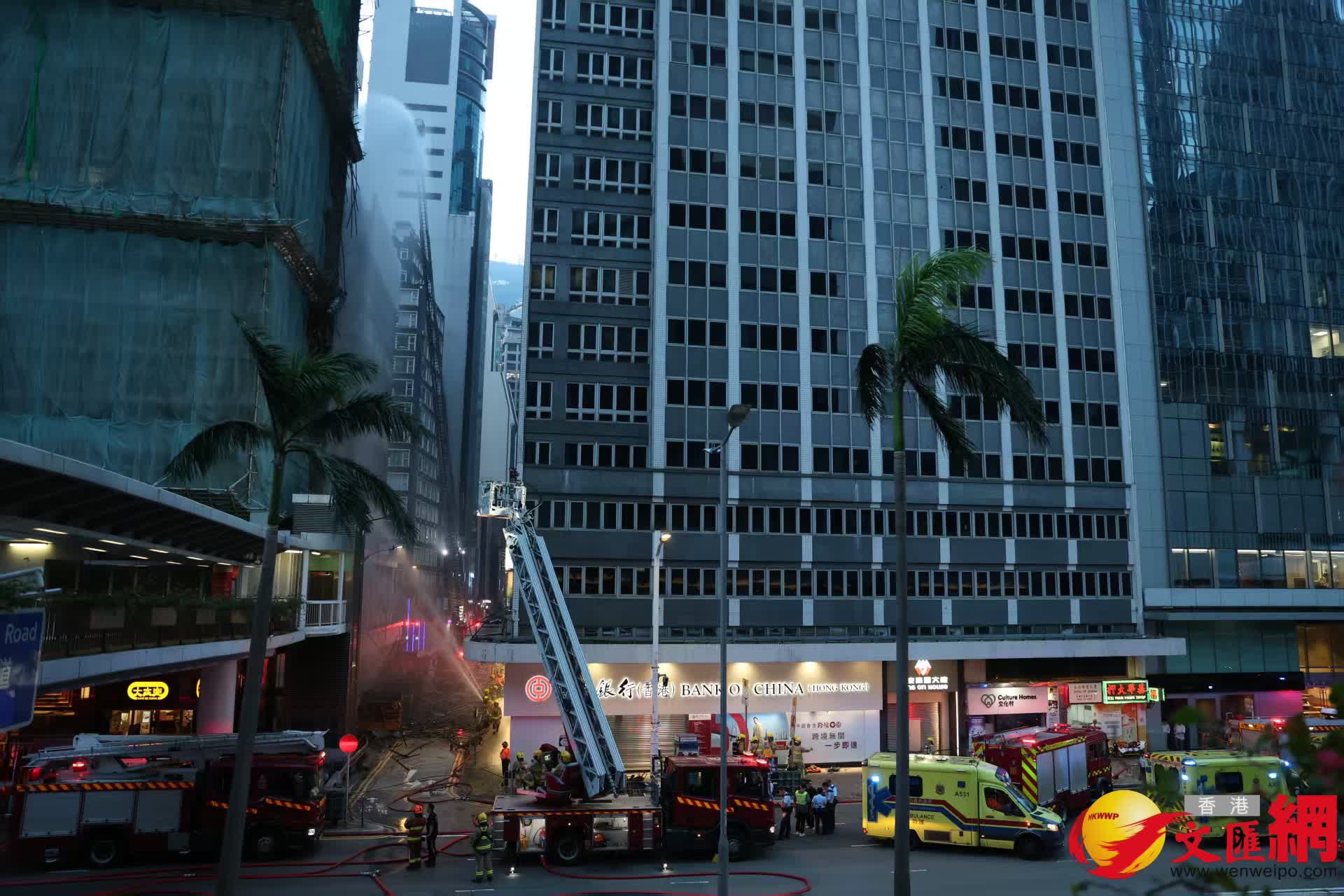 干諾道中34至37號大廈後巷棚架起火, 3男子被困, 初步未有人受傷。香港文匯報記者萬霜靈 攝