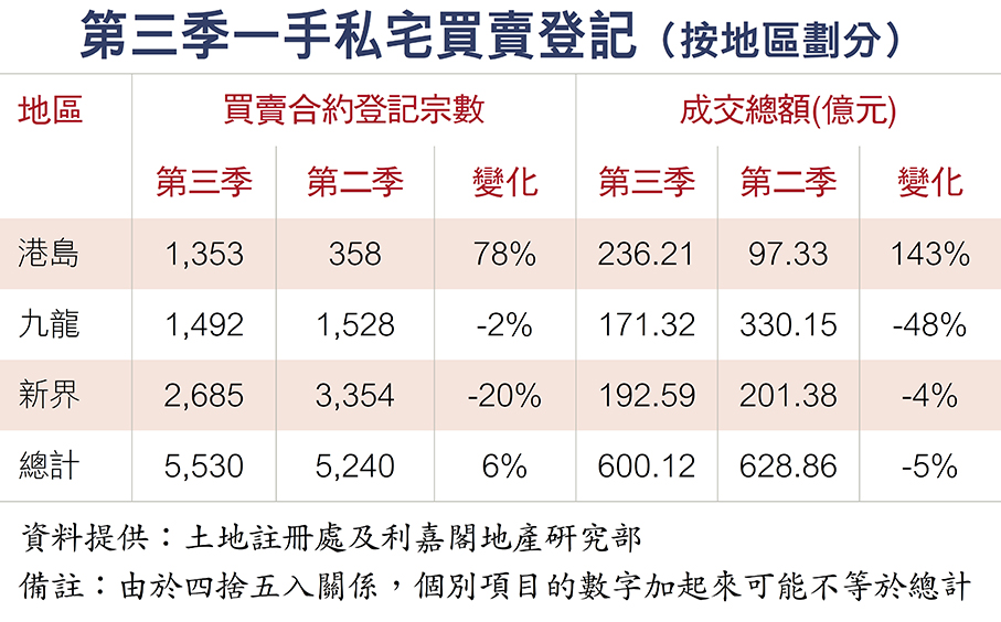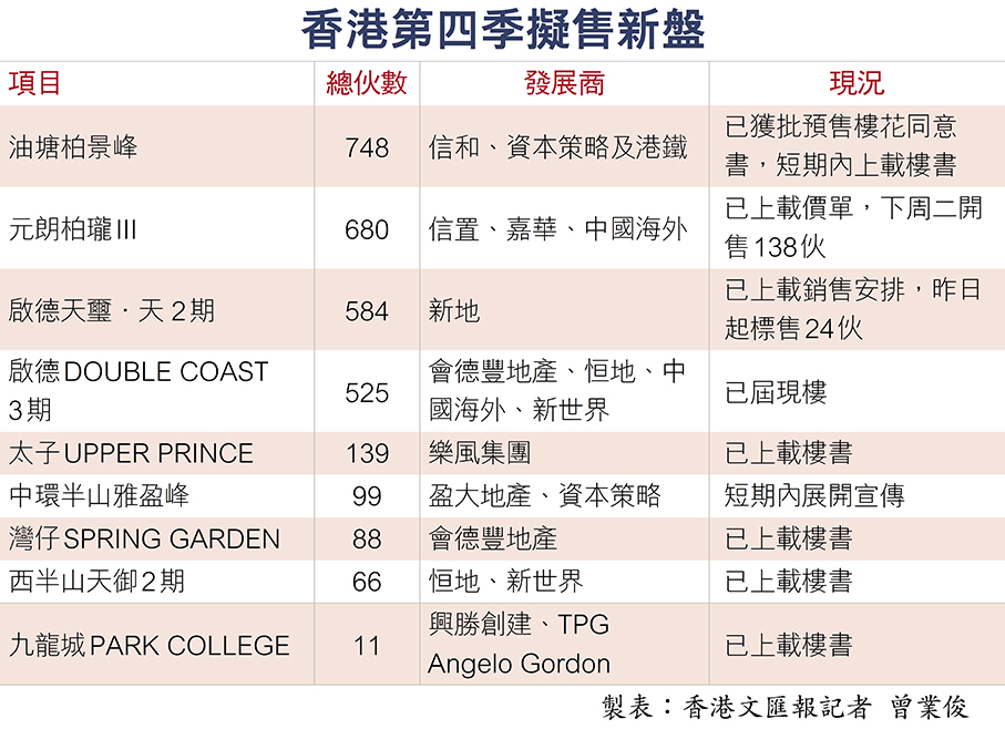 至於第四季供應方面,啟德區為市區新樓供應庫,大機會成為季內供應主要來源,其中包括鄰近港鐵啟德站,由新地發展的天璽·天2期,涉及約584伙,早前已經上載樓書,並推出4房單位招標。至於位處跑道區、由會德豐牽頭發展的DOUBLE COAST III季內有機會推出,涉525伙。