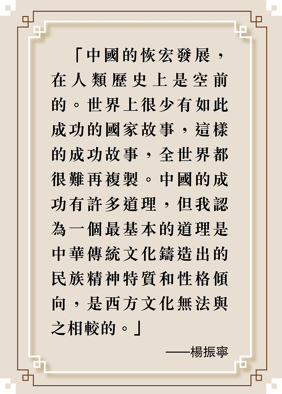 楊振寧的一生,正如他最喜愛的詩人艾略特的詩句詮釋的那樣:「我的起點,就是我的終點;我的終點,就是我的起點。」他用一個世紀的生命旅程,取得了峙立如嵩、博觀如海的學術成就,書寫了功在世界、心懷家國的雋永篇章。