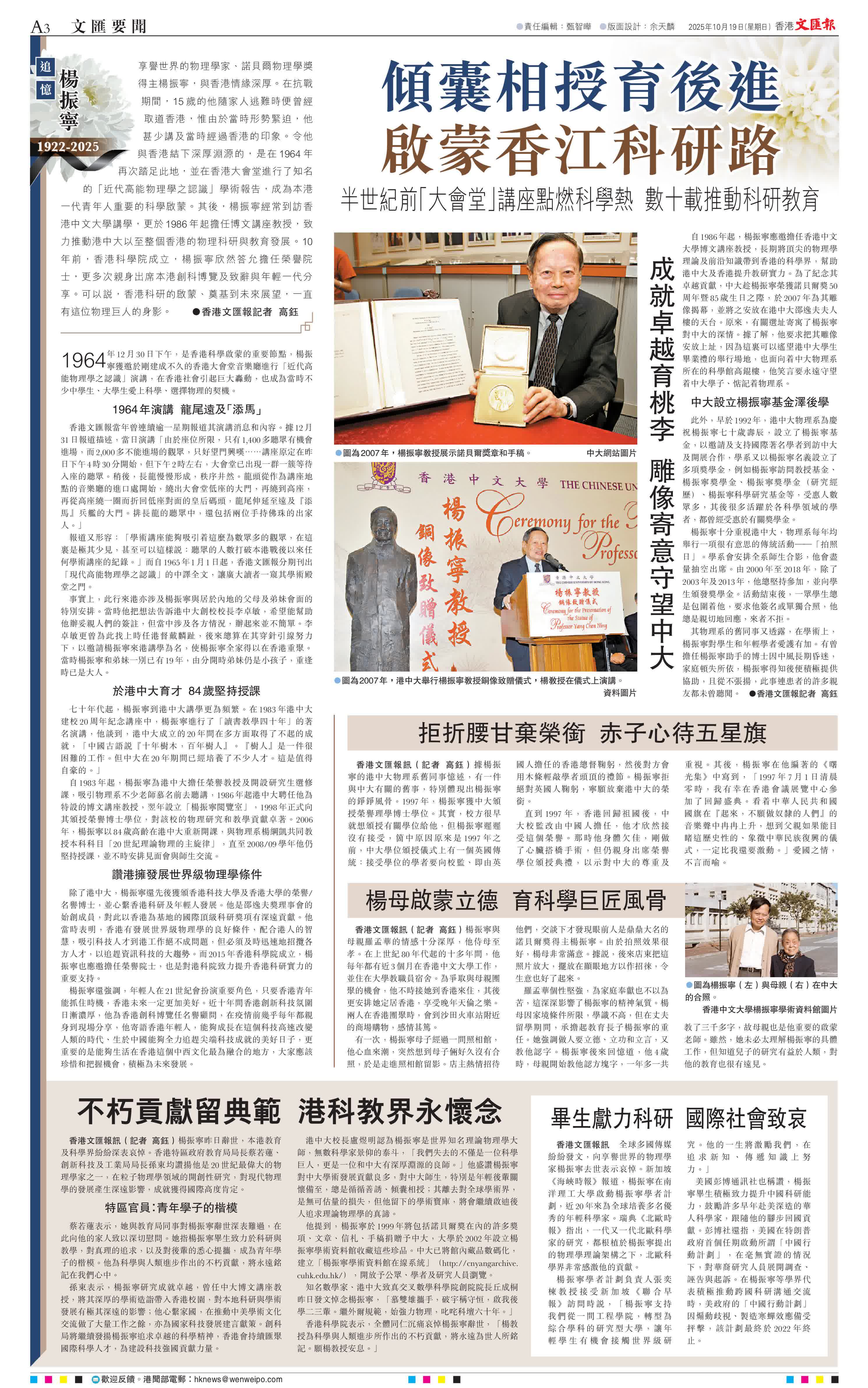 (香港文匯報記者 高鈺)享譽世界的物理學家、諾貝爾物理學獎得主楊振寧,與香港情緣深厚。在抗戰期間,15歲的他隨家人逃難時便曾經取道香港,惟由於當時形勢緊迫,他甚少講及當時經過香港的印象。令他與香港結下深厚淵源的,是在1964年再次踏足此地,並在香港大會堂進行了知名的「近代高能物理學之認識」學術報告,成為本港一代青年人重要的科學啟蒙。其後,楊振寧經常到訪香港中文大學講學,更於1986年起擔任博文講座教授,致力推動港中大以至整個香港的物理科研與教育發展。10年前,香港科學院成立,楊振寧欣然答允擔任榮譽院士,更多次親身出席本港創科博覽及致辭與年輕一代分享。可以說,香港科研的啟蒙、奠基到未來展望,一直有這位物理巨人的身影。