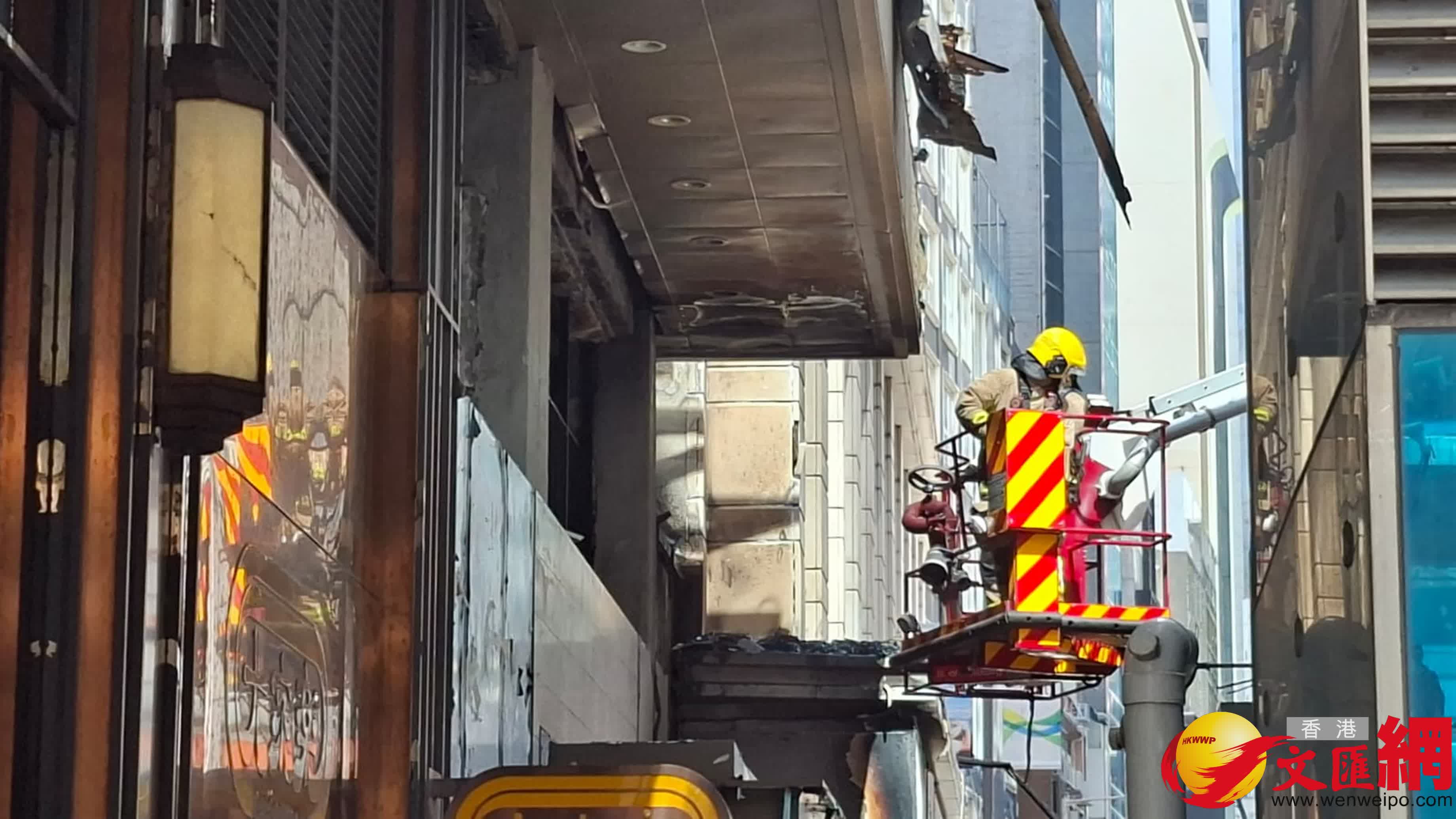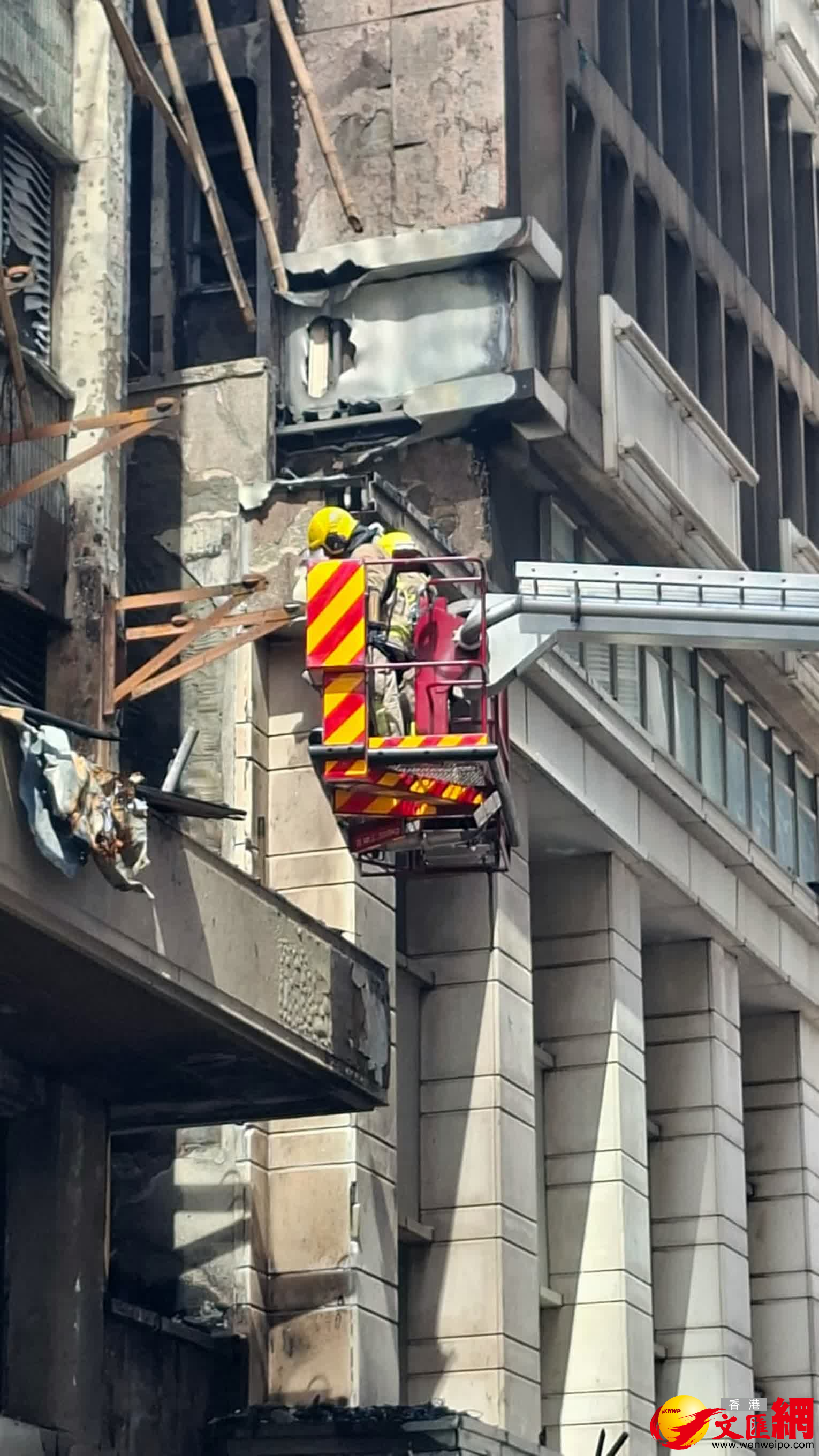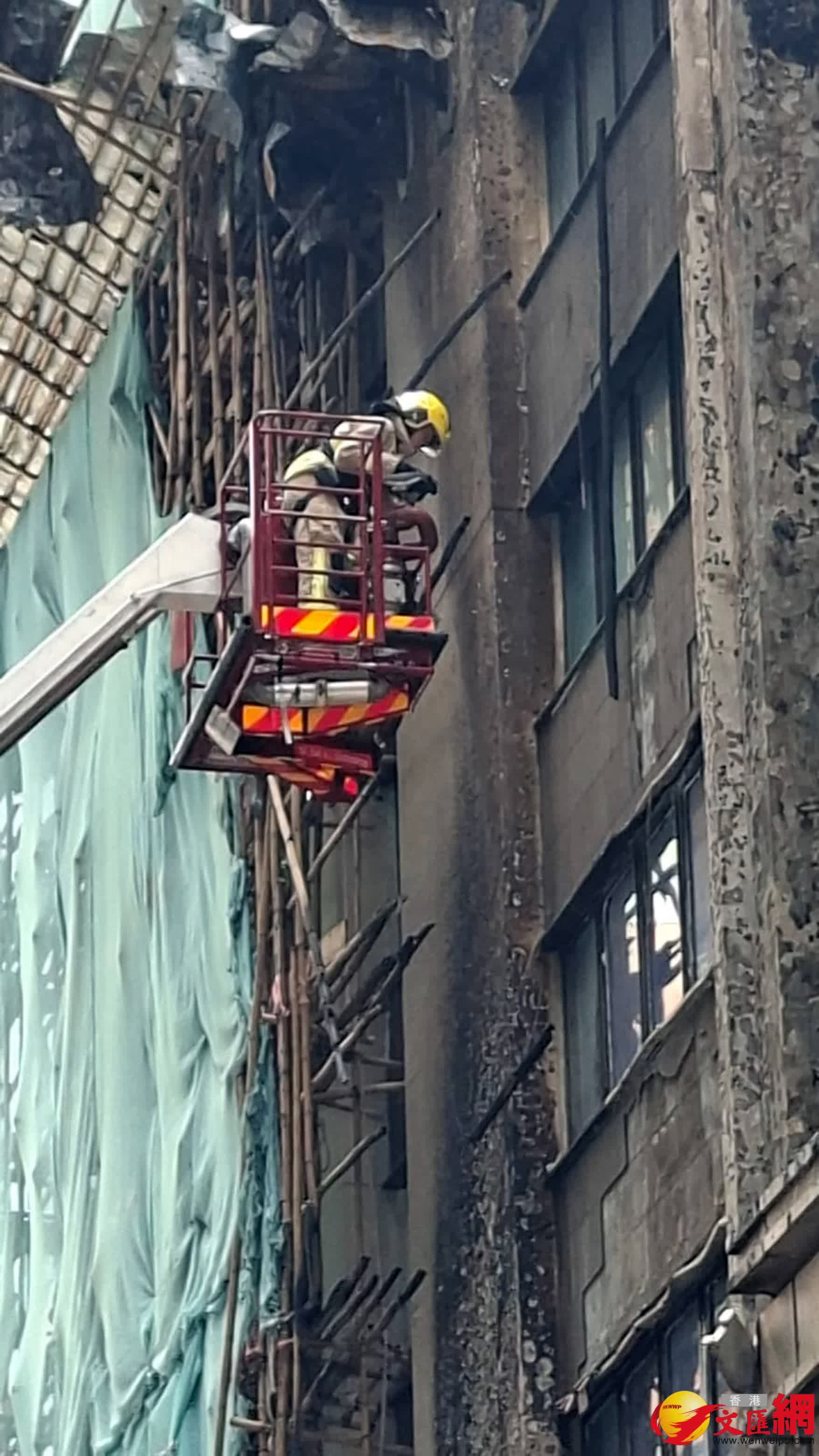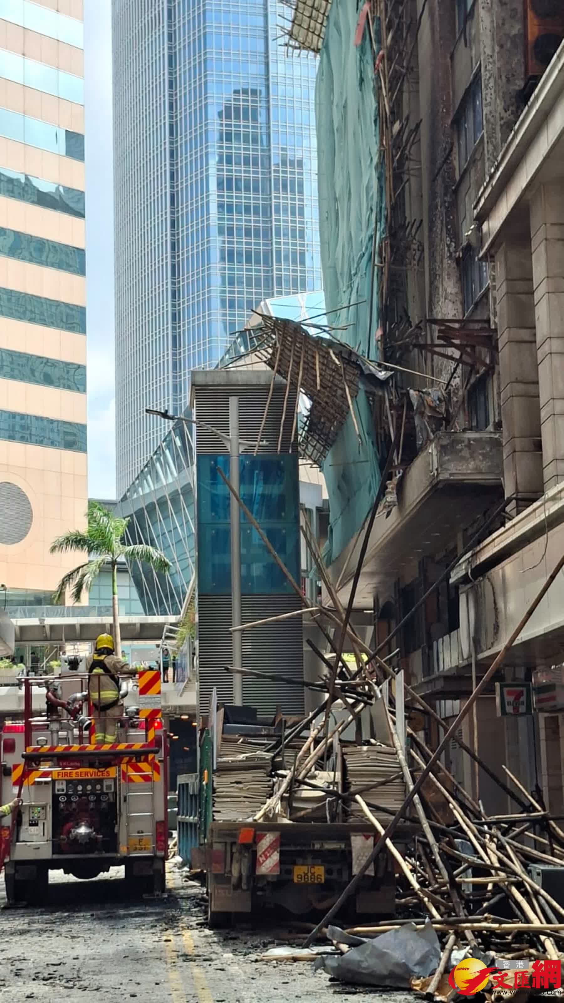 香港文匯報訊(記者 蕭景源)中環干諾道中華懋大廈昨日(18日)發生三級火,外牆多層大片棚架被焚,造成4人受傷送院,當中1人今日(19日)情況仍然危殆。香港文匯報記者上午重返現場了解情況,可見現場仍未解封,涉事大廈外牆嚴重熏黑,有牆身出現剝落,燒焦的棚架竹枝碎片散落一地,多層仍有部分竹枝搖搖欲墜,毗鄰大廈外牆亦有金屬組件被燒溶,屋宇署人員到場視察損毀情況,消防員升起雲梯查看外牆。消防處成立的專隊正調查起火及火勢蔓延迅速的原因,初步相信火勢蔓延與棚架下的環保斗雜物無關。