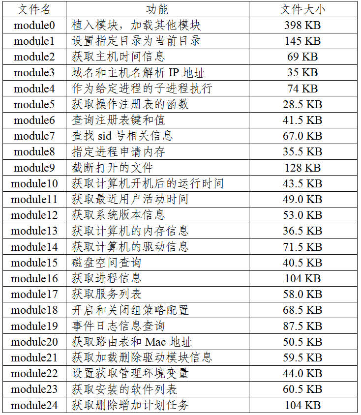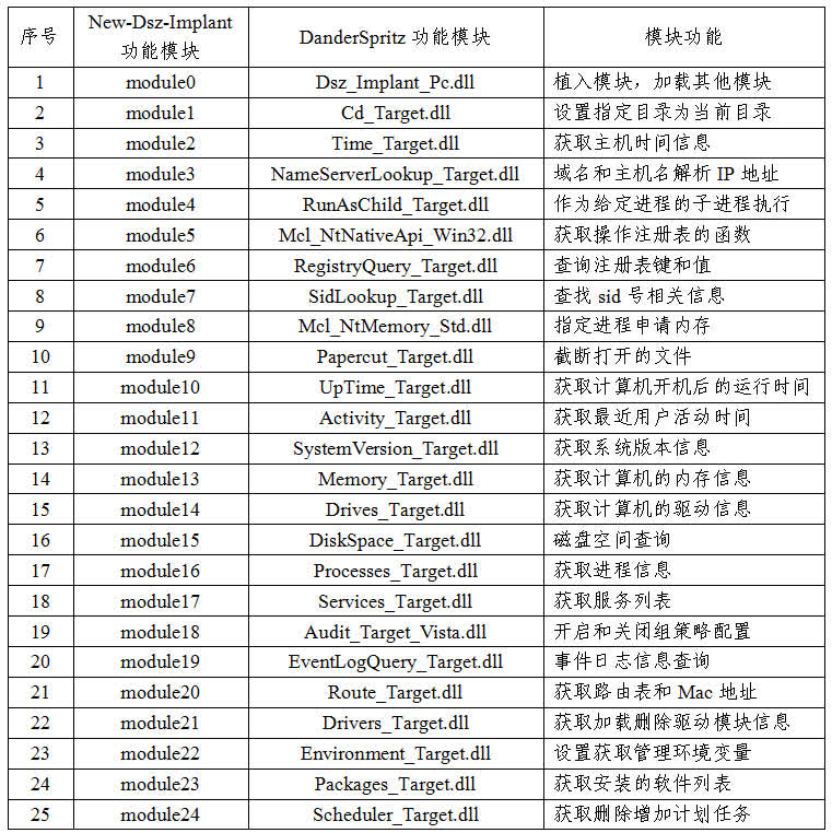 「New-Dsz-Implant」由「eHome_0cx」加載運行,在攻擊活動中配合「Back_Eleven」所搭建的數據傳輸鏈路使用。其自身無具體竊密功能,需通過接收主控端指令加載功能模塊,實現各項竊密功能。本次網攻事件中,攻擊者使用「New-Dsz-Implant」加載了25個功能模塊,各模塊功能情況如下表所示。