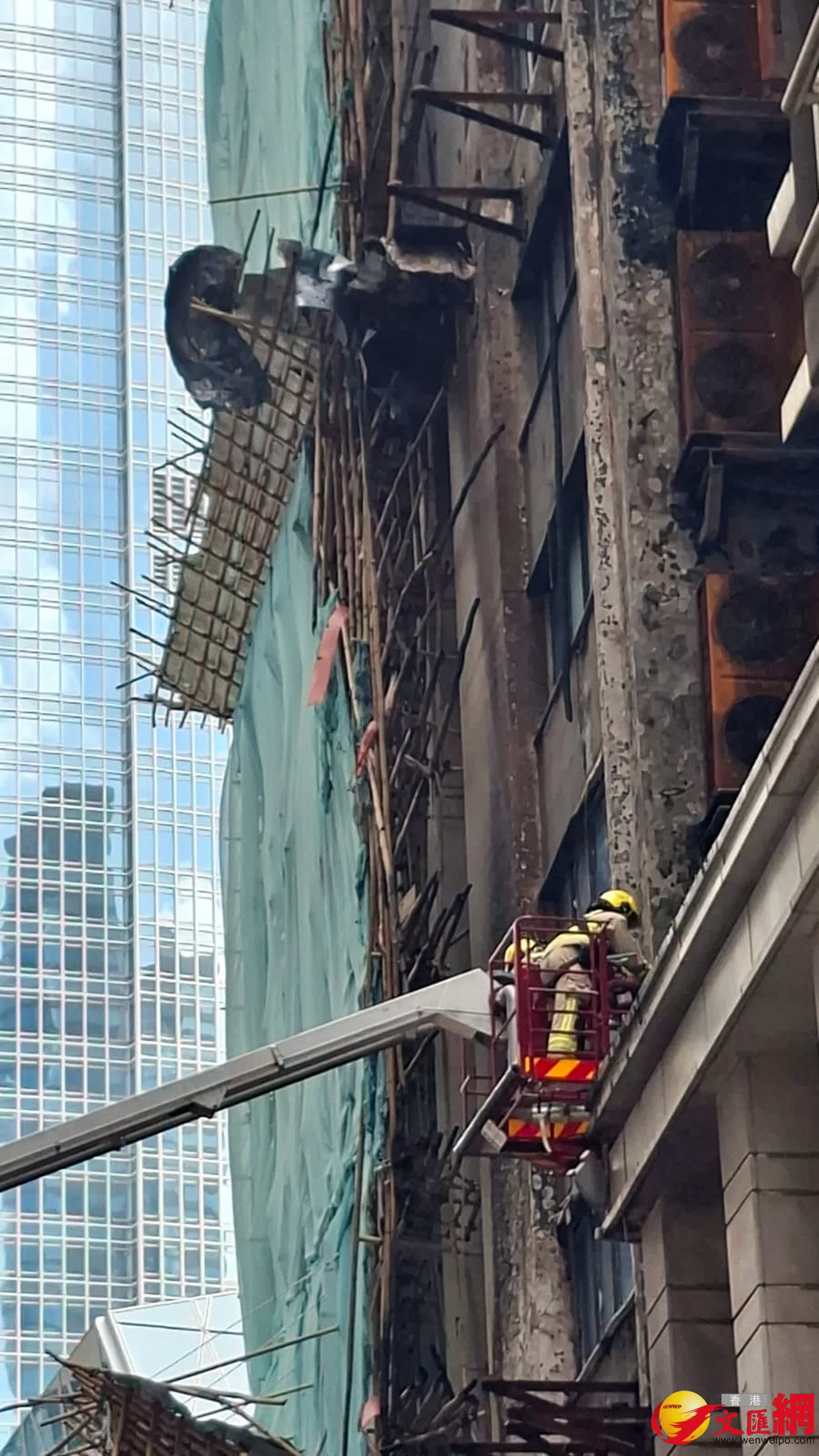火警現場場為中環干諾道中34至37號華懋大廈,上址外牆搭有棚架正進行維修工程。消防處消防區長盧瑞生昨日深夜交代火警詳情時表示,他們在昨日下午4時24分接報後4分鐘到場,發現大廈火勢蔓延迅速,多層棚架已整幅棚架陷入火海,冒起大量濃煙,火屑亦影響到隔鄰大廈,地面一輛貨車和一個環保斗亦被波及,但大廈內部未受嚴重影響。