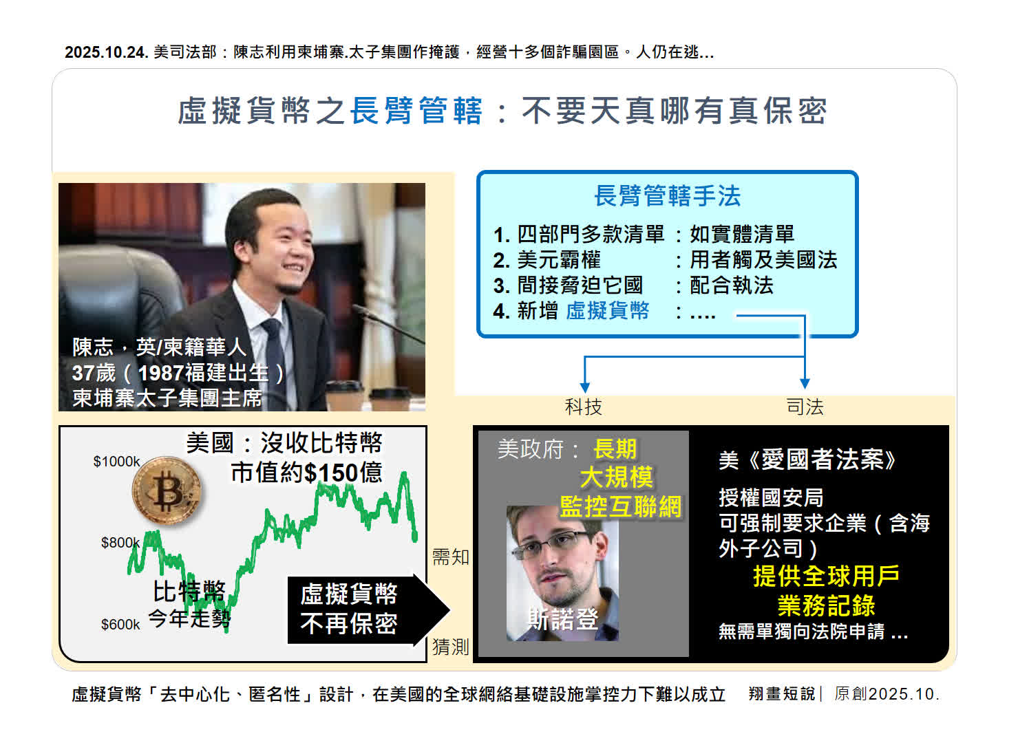 文章完成時,又有一則新聞值得關注,美國長臂管轄已延伸至虛擬貨幣領域。美國司法部指控柬埔寨太子集團主席陳志利用集團作掩護經營十多個詐騙園區,雖然陳志仍在逃,美國仍可以沒收其涉案價值約150億美元的比特幣。此案中,不少分析指出美國在互聯網、伺服器、司法權等領域同樣擁有霸權,其以「交易涉及美元」與《愛國者法案》為依據,再加上美國政府長期大規模監控互聯網,「美國自己是世界公認的黑客帝國」(中國外交部),憑藉對全球網絡基礎設施的掌控,輕易打破虛擬貨幣「去中心化、匿名性」的宣稱,美國長臂管轄仍然在擴張中。