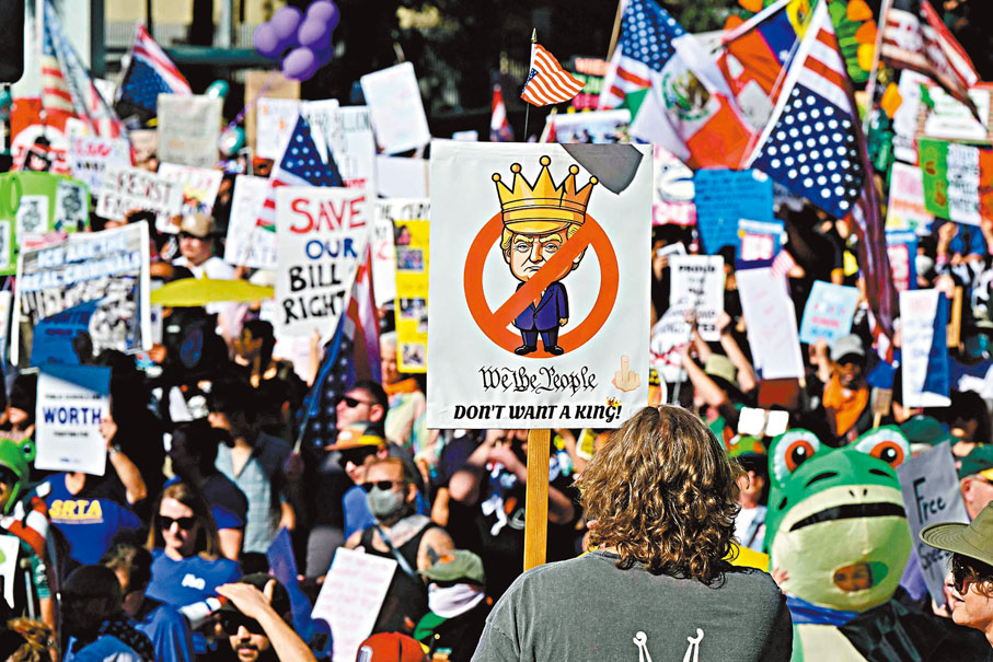 香港文匯報訊 美國50個州份的多個地區上周六(10月18日)爆發「無王日」(No Kings Day)示威潮,全美出現超過2,600場示威,主辦方估計多達700萬人走上街頭,抗議總統特朗普政府在移民、關稅、法治和人權等領域連串爭議措施。今次行動延續今年6月14日特朗普生日期間的同名示威活動,專家估計這是美國近代史上規模最大的抗議活動之一。