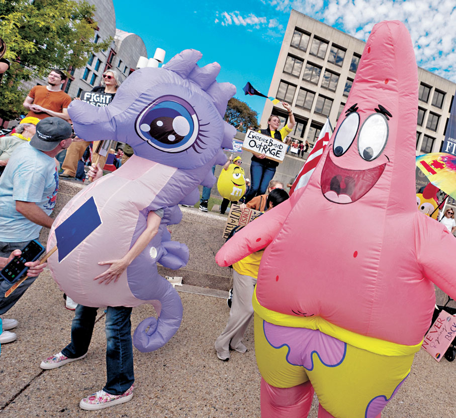 路透社指出,全美多地示威都有大量抗議者身穿各種充氣公仔服飾,這一主題來自俄勒岡州波特蘭市民抗議執法部門拘捕非法移民時創作的非暴力主題。在波特蘭,居民阿德勒身穿龍蝦造型服飾,與扮獨角獸、公雞和青蛙的朋友們同行,「這能讓他們(指特朗普當局)知道,我們在認真表達訴求,但我們並不危險,也不暴力。」