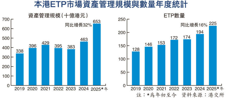 香港交易所買賣基金(ETF)市場迎來爆發式增長。港交所(0388)公布最新數據顯示,今年以來本港ETF日均成交額達378億元,穩居全球第三大ETF市場,僅次於美國(16,863億元)及內地(3,158億元)。更值得關注的是,今年新增41隻交易所買賣產品(ETP),不僅突破歷史發行紀錄,整體資產管理規模激增至6,530億元,按年大幅增長32%,展現香港作為國際金融中心的強大產品創新力與市場吸引力。港交所預告,未來將積極拓展更多新產品,如個股槓桿及反向產品(L&I產品)、虛擬資產、備兌認購期權ETF等。●香港文匯報記者 周紹基