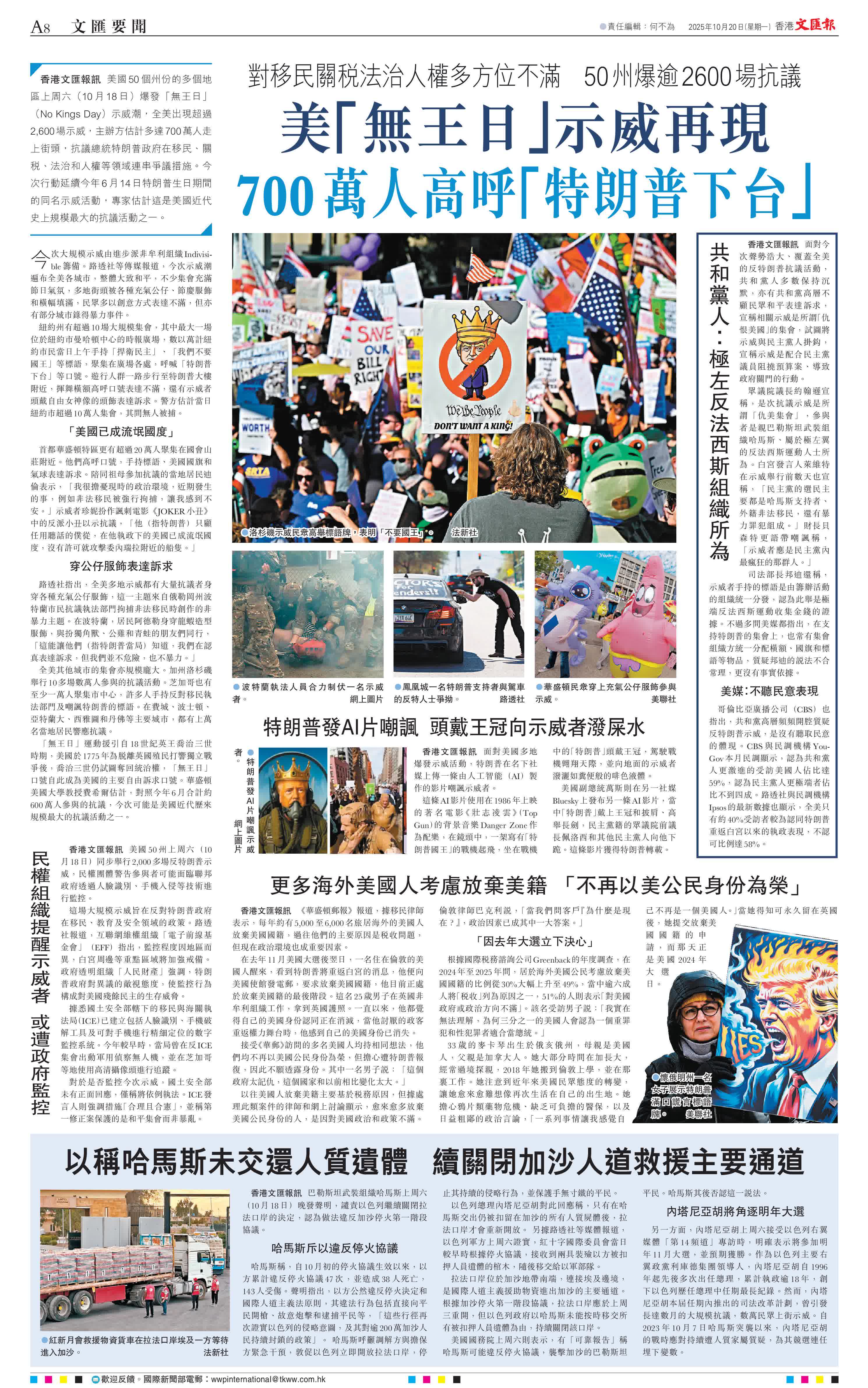 香港文匯報訊 美國50個州份的多個地區上周六(10月18日)爆發「無王日」(No Kings Day)示威潮,全美出現超過2,600場示威,主辦方估計多達700萬人走上街頭,抗議總統特朗普政府在移民、關稅、法治和人權等領域連串爭議措施。今次行動延續今年6月14日特朗普生日期間的同名示威活動,專家估計這是美國近代史上規模最大的抗議活動之一。