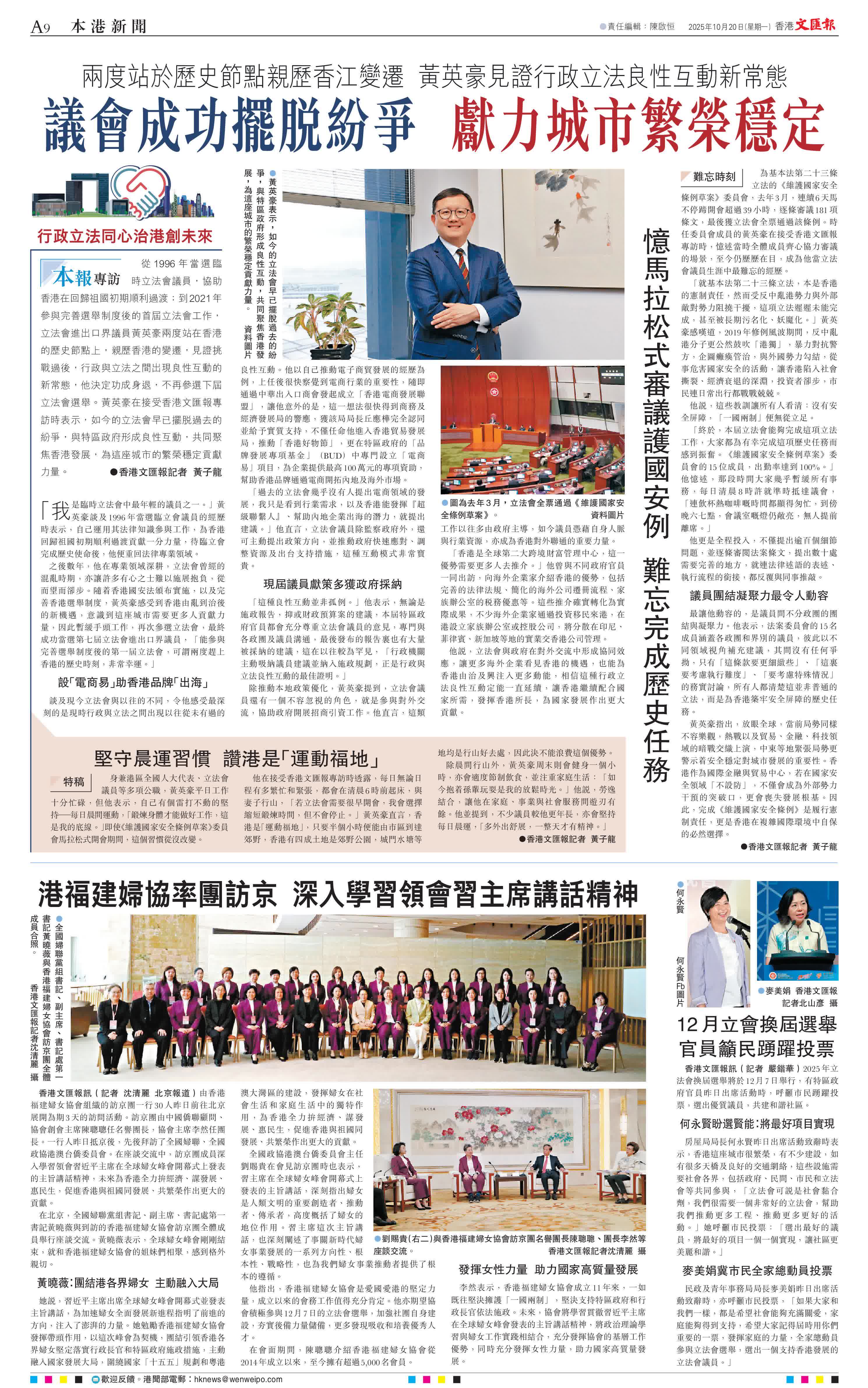 (香港文匯報記者 黃子龍)從1996年當選臨時立法會議員,協助香港在回歸祖國初期順利過渡;到2021年參與完善選舉制度後的首屆立法會工作,立法會進出口界議員黃英豪兩度站在香港的歷史節點上,親歷香港的變遷,見證挑戰過後,行政與立法之間出現良性互動的新常態,他決定功成身退,不再參選下屆立法會選舉。黃英豪在接受香港文匯報專訪時表示,如今的立法會早已擺脫過去的紛爭,與特區政府形成良性互動,共同聚焦香港發展,為這座城市的繁榮穩定貢獻力量。
